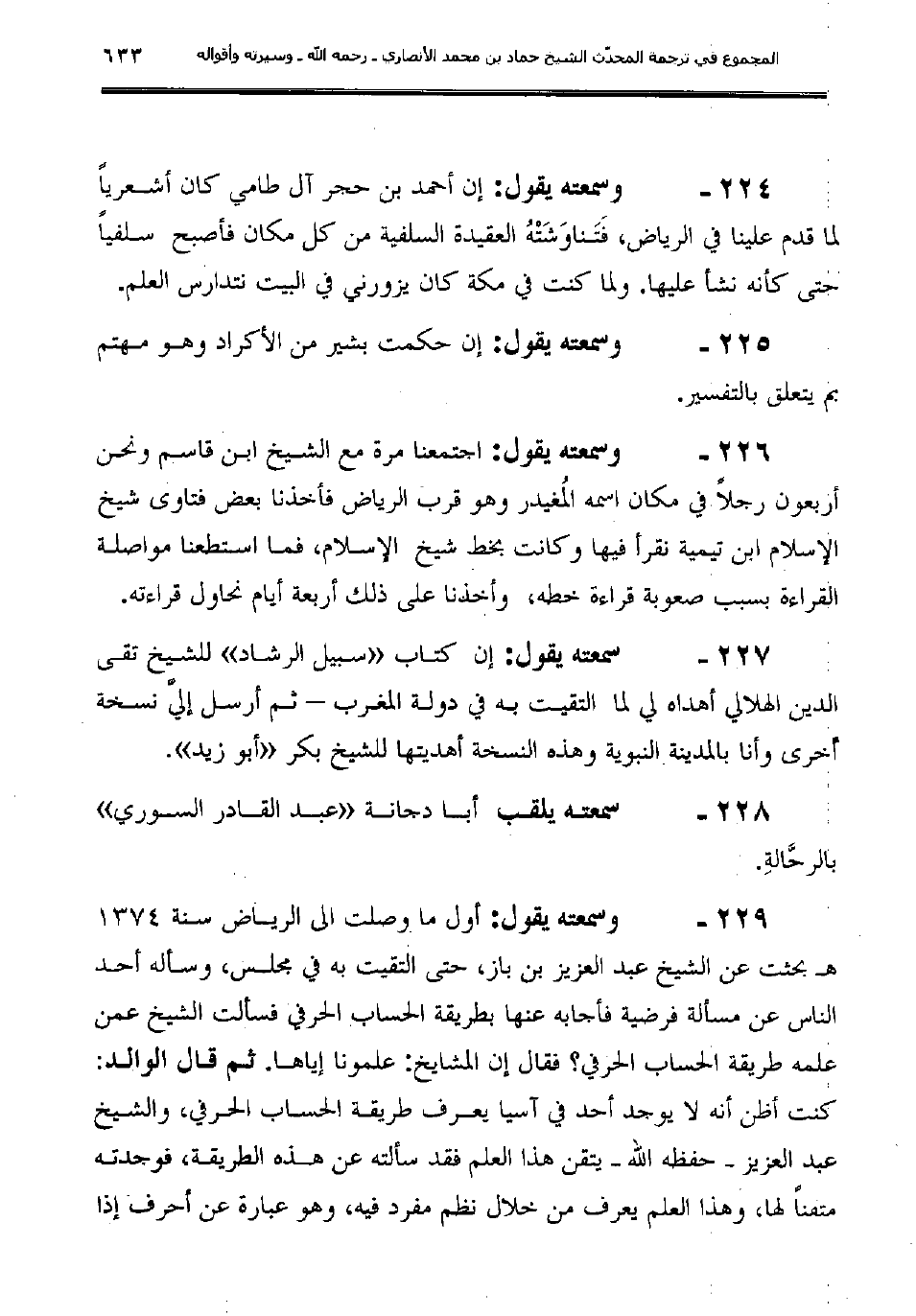 226ـ وسمعته يقول: "اجتمعنا مرة مع الشيخ ابن قاسم ونحن أربعون رجلاً في مكان اسمه المُغيدر وهو قرب الرياض فأخذنا بعض فتاوى شيخ الإسلام ابن تيمية نقرأ فيها وكانت بخط شيخ الإسلام، فما استطعنا مواصلة القراءة بسبب صعوبة قراءة خطه، وأخذنا على ذلك أربعة أيام نحاول قراءته."