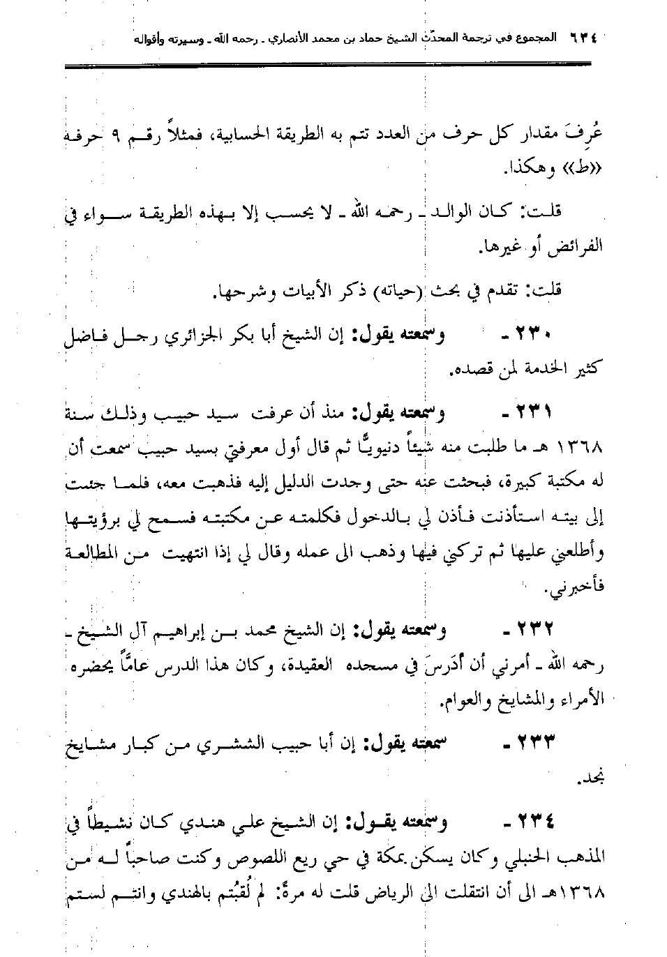 230ـ وسمعته يقول: "إن الشيخ أبا بكر الجزائري رجل فاضل كثير الخدمة لمن قصده".