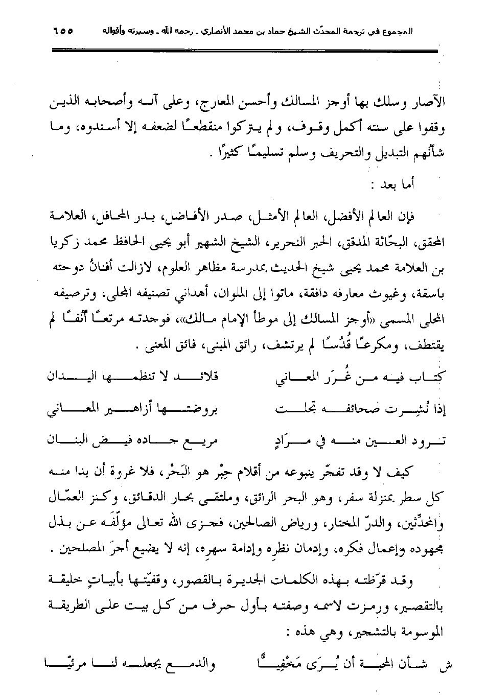 فإن العالم الأفضل، العالم الأمثل، صدر الأفاضل، بدر المحافل، العلامة المحقق، البحّاثة المدقق، الحبر النحرير، الشيخ الشهير أبو يحيى الحافظ محمد زكريا بن العلامة محمد يحيى شيخ الحديث بمدرسة مظاهر العلوم، لازالت أفنانُ دوحته باسقة، وغيوث معارفه دافقة، ماتوا إلى الملوان، أهداني تصنيفه المجلى، وترصيفه المحلى المسمى "أوجز المسالك إلى موطأ الإمام مالك"، فوجدته مرتعًا أُنُفًا لم يقتطف، ومكرعًا قُدُسًا لم يرتشف، رائق المبنى، فائق المعنى.