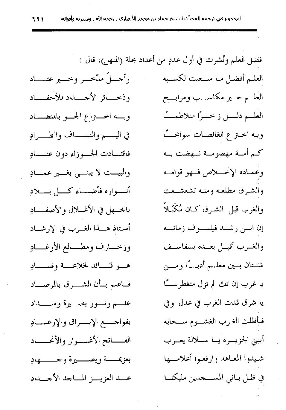 فضل العلم ونُشرت في أول عددٍ من أعداد مجلة (المنهل) ، قال: