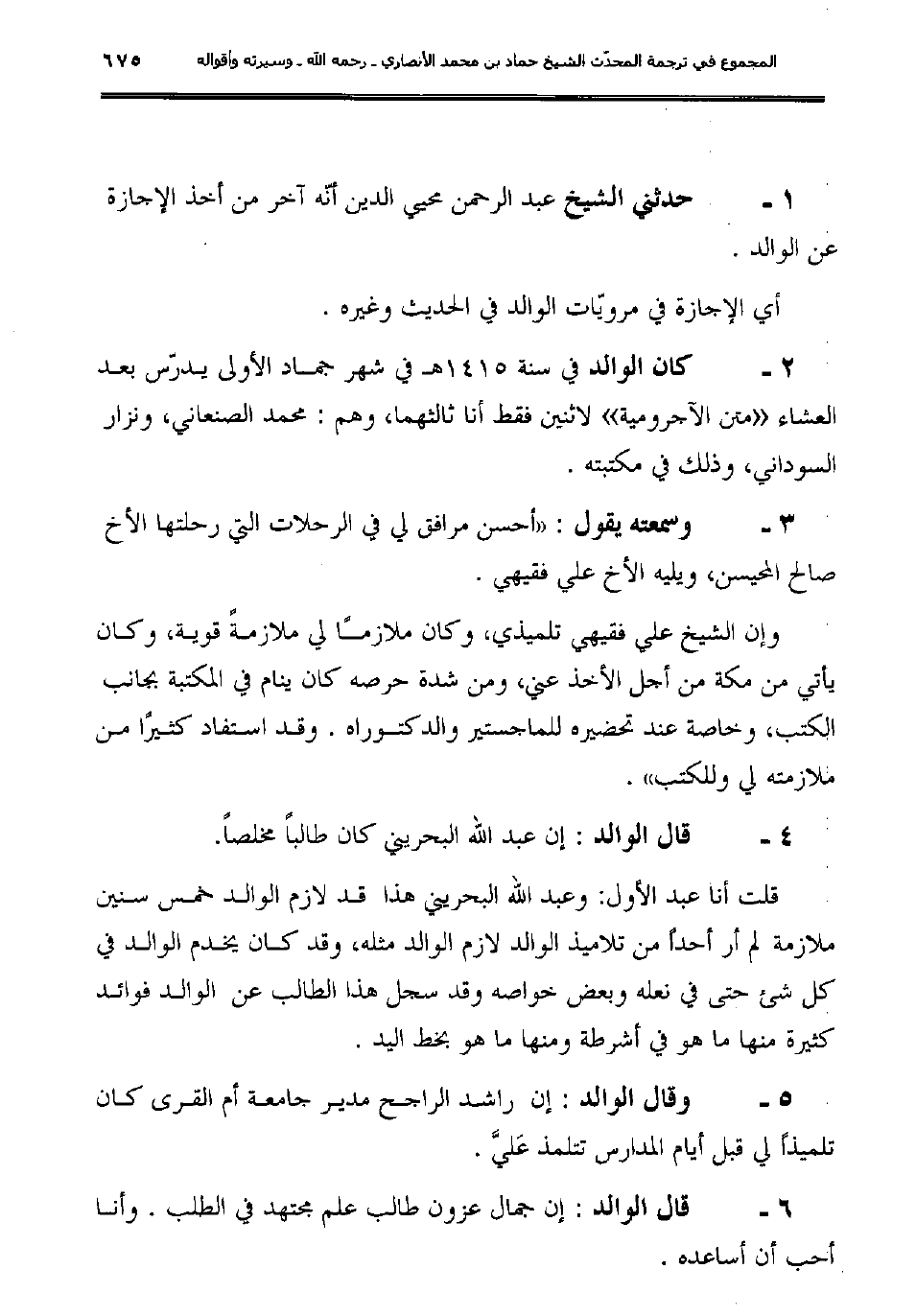 2ـ كان الوالد في سنة 1415هـ في شهر جماد الأولى يدرّس بعد العشاء (متن الآجرومية) لاثنين فقط أنا ثالثهما، وهم: محمد الصنعاني، ونزار السوداني، وذلك في مكتبته".