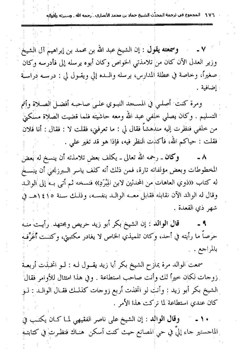9ـ قال الوالد: "إن الشيخ بكر أبو زيد حريص ومجتهد رأيت منه حرصاً ما رأيته في أحد، وكان تلميذي الخاص لا يغادر مكتبتي، وكنت أُعَرِّفه بالمراجع".