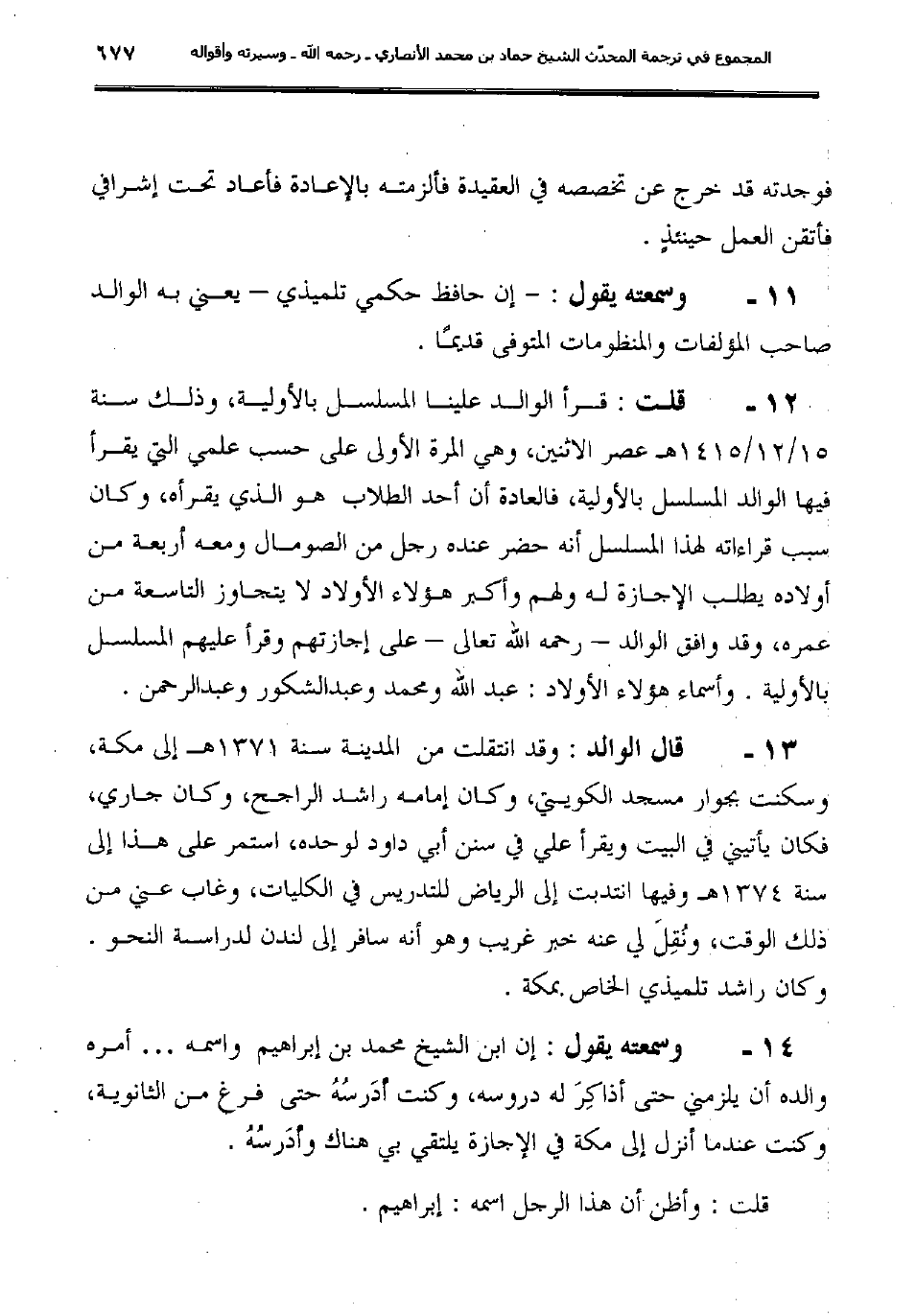 11ـ وسمعته يقول: "-إن حافظ حكمي تلميذي- يعني به الوالد صاحب المؤلفات والمنظومات المتوفى قديمًا".
