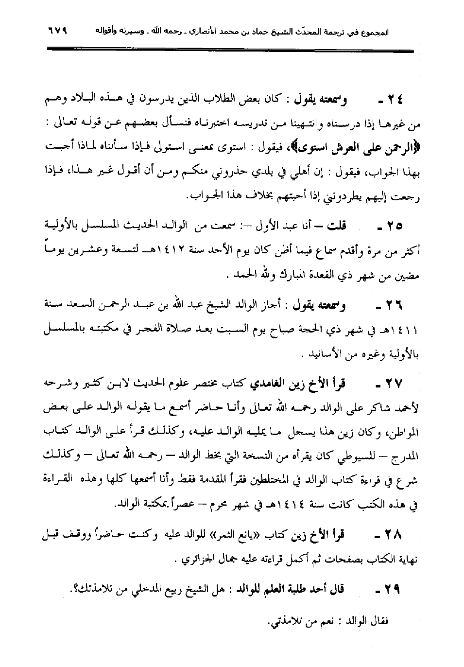 27ـ قرأ الأخ زين الغامدي كتاب مختصر علوم الحديث لابن كثير وشرحه لأحمد شاكر على الوالد رحمه الله تعالى وأنا حاضر أسمع ما يقوله الوالد على بعض المواطن، وكان زين هذا يسجل ما يمليه الوالد عليه، وكذلك قرأ على الوالد كتاب المدرج – للسيوطي كان يقرأه من النسخة التي بخط الوالد –رحمه الله تعالى– وكذلك شرع في قراءة كتاب الوالد في المختلطين فقرأ المقدمة فقط وأنا أسمعها كلها وهذه القراءة في هذه الكتب كانت سنة 1414هـ في شهر محرم – عصراً بمكتبة الوالد.
