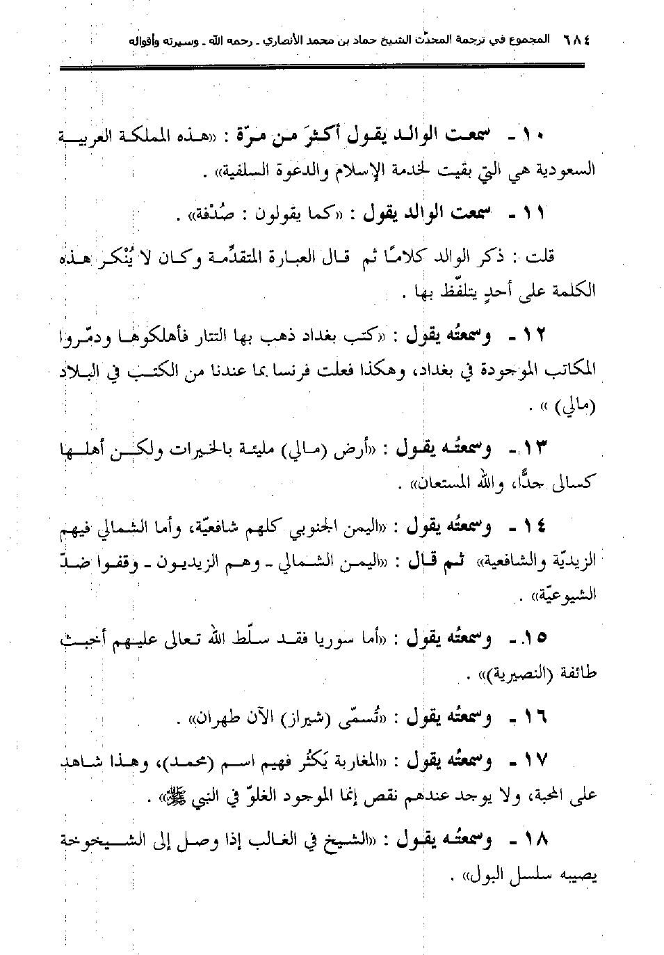 14ـ وسمعتُه يقول: "اليمن الجنوبي كلهم شافعيّة، وأما الشمالي فيهم الزيديّة والشافعية" ثم قال: "اليمن الشمالي ـ وهم الزيديون ـ وقفوا ضدّ الشيوعيّة".