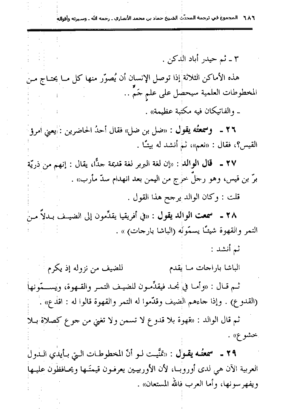 28ـ سمعت الوالد يقول: "في أفريقيا يقدِّمون إلى الضيف بدلاً من التمر والقهوة شيئًا يسمّونَه (الباشا بارجات) ".