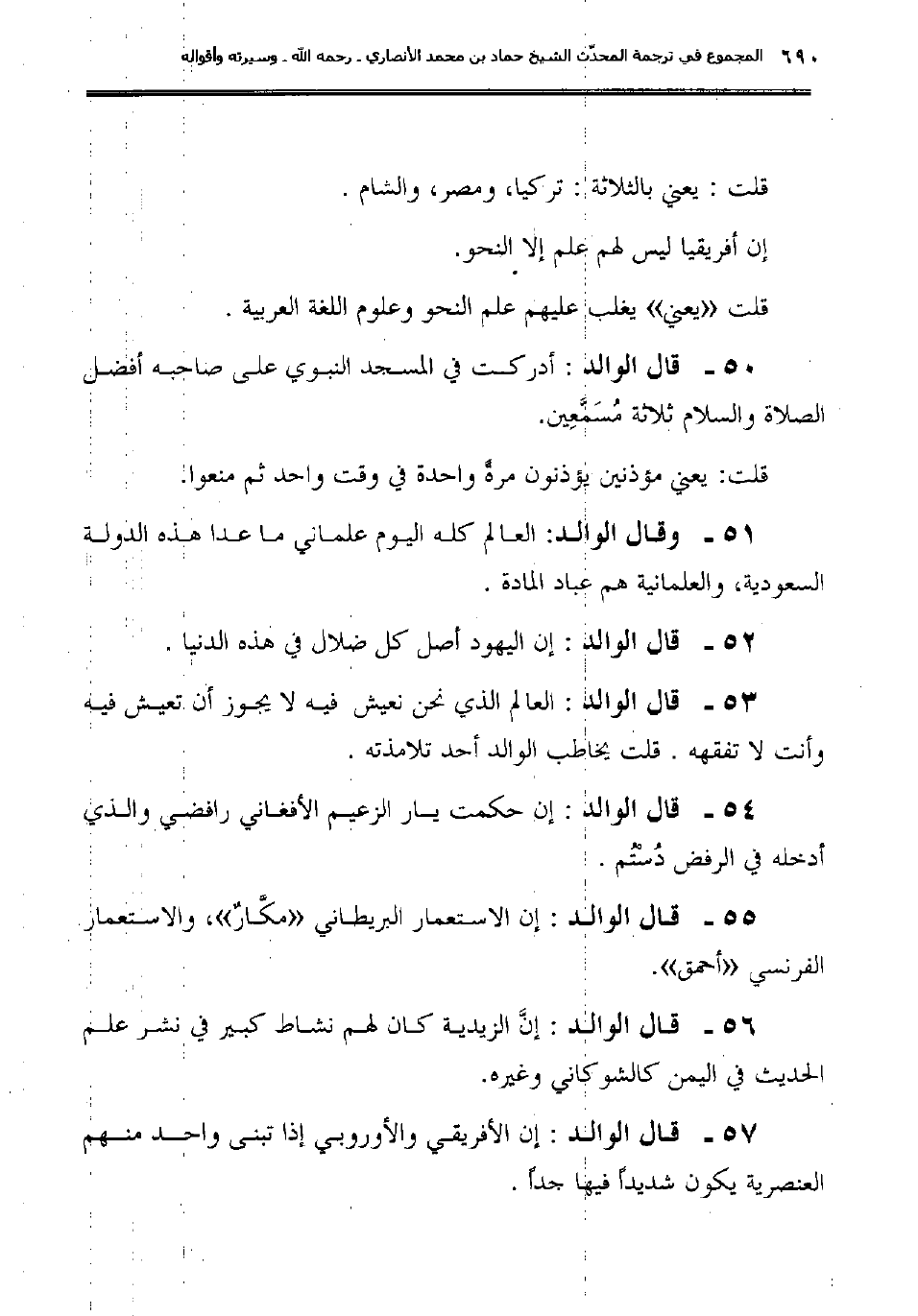 57ـ قال الوالد: "إن الأفريقي والأوروبي إذا تبنى واحد منهم العنصرية يكون شديداً فيها جداً".