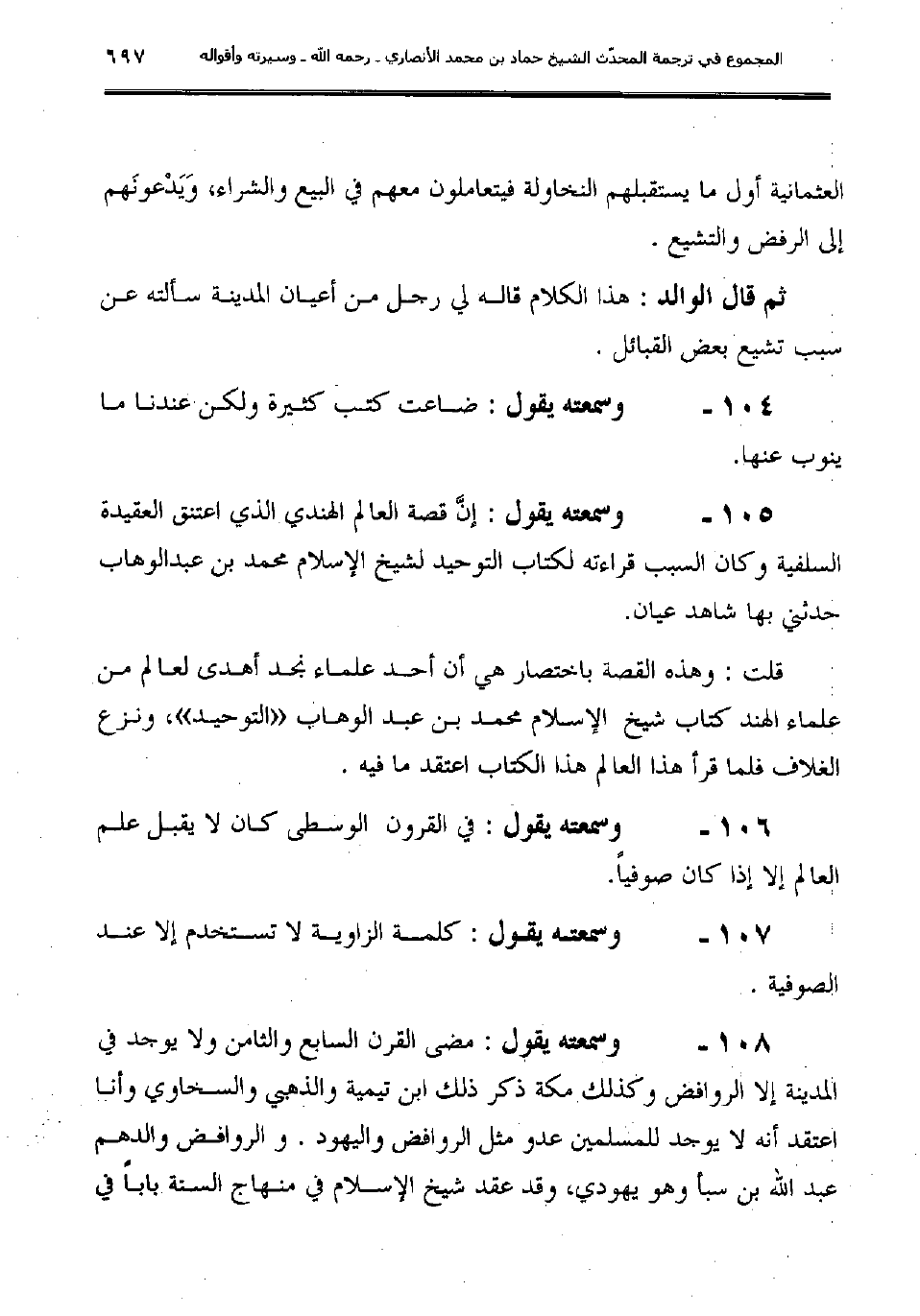 105ـ وسمعته يقول: "إنَّ قصة العالم الهندي الذي اعتنق العقيدة السلفية وكان السبب قراءته لكتاب التوحيد لشيخ الإسلام محمد بن عبد الوهاب حدثني بها شاهد عيان".
