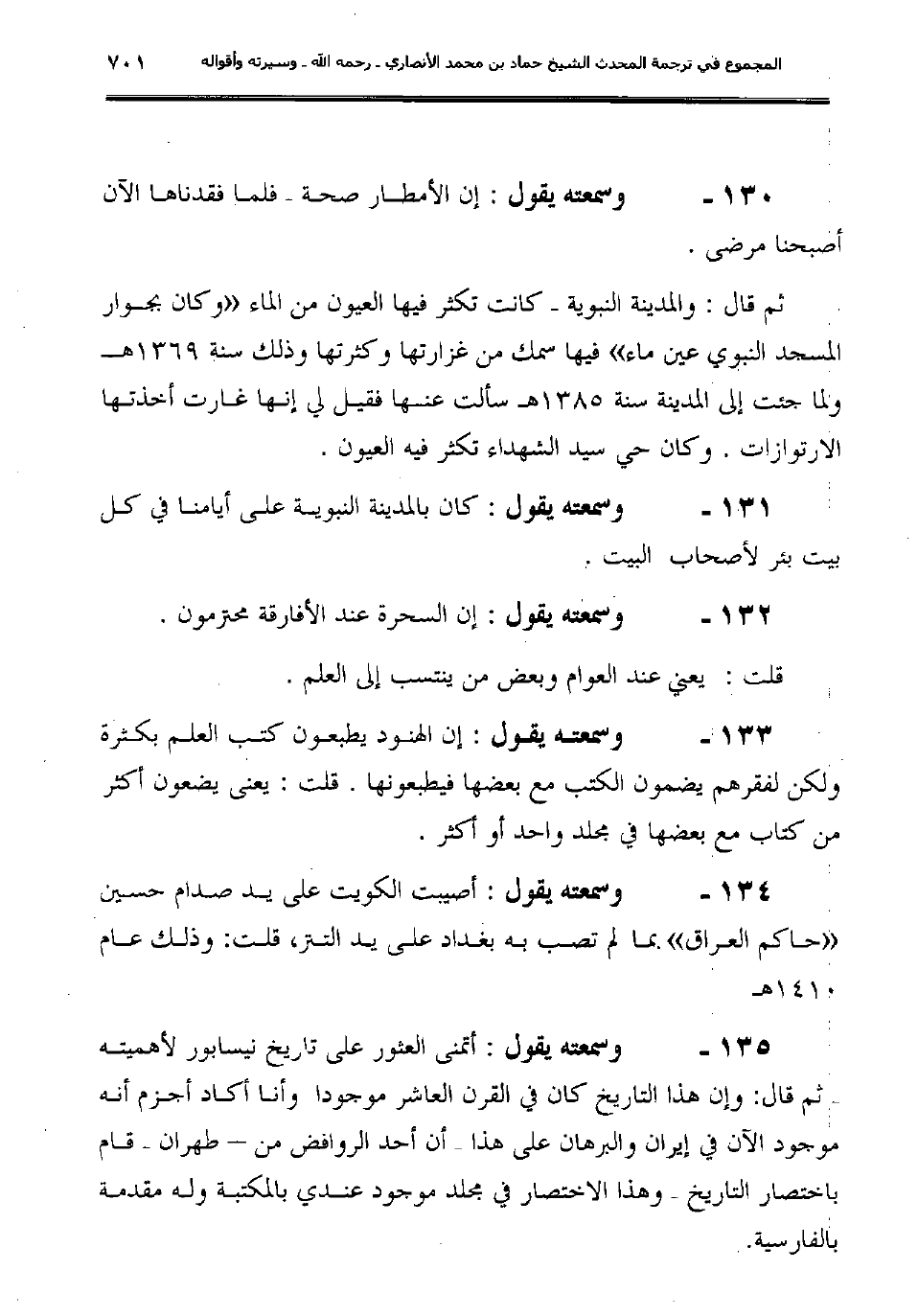 135ـ وسمعته يقول: "أتمنى العثور على تاريخ نيسابور لأهميته –ثم قال: وإن هذا التاريخ كان في القرن العاشر موجوداً وأنا أكاد أجزم أنه موجودٌ الآن في إيران والبرهان على هذا –أنَّ أحد الروافض من –طهران– قام باختصار التاريخ– وهذا الاختصار في مجلد موجود عندي بالمكتبة وله مقدمة بالفارسية.