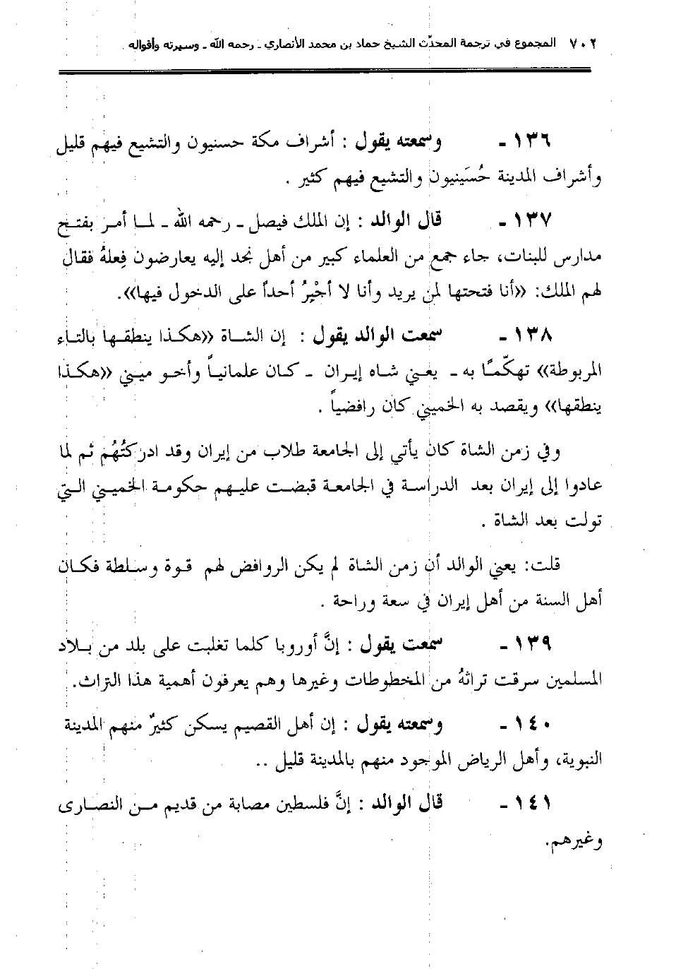 138ـ سمعت الوالد يقول: " إن الشاة (هكذا ينطقها بالتاء المربوطة) تهكّمًا به -يعني شاه إيران- كان علمانياً وأخو ميني (هكذا ينطقها) ويقصد به الخميني كان رافضيا وفي زمن الشاة كان يأتي إلى الجامعة طلاب من إيران وقد ادركتُهُم ثم لما عادوا إلى إيران بعد الدراسة في الجامعة قبضت عليهم حكومة الخميني التي تولت بعد الشاة".