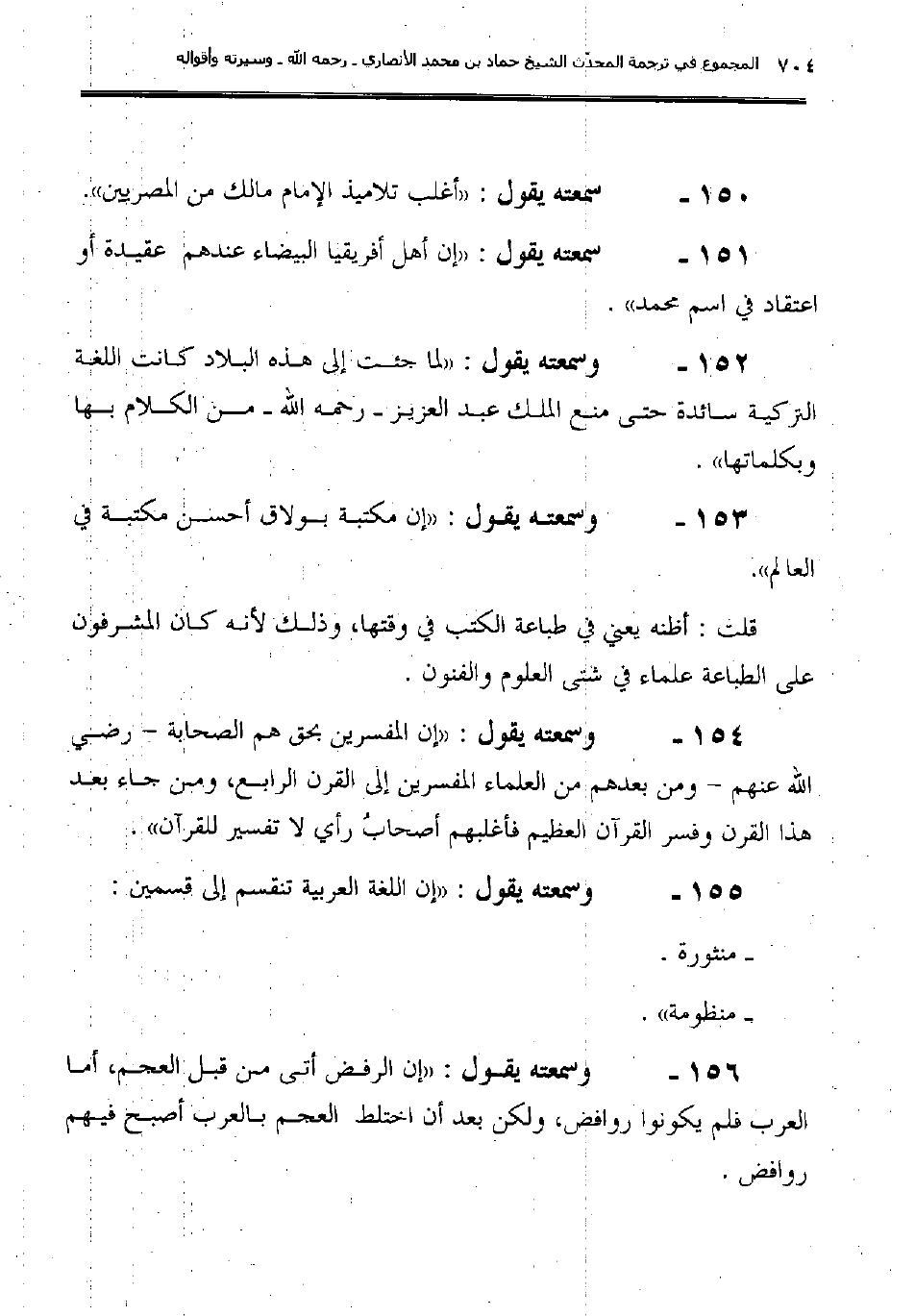 151ـ سمعته يقول: "إن أهل أفريقيا البيضاء عندهم عقيدة أو اعتقاد في اسم محمد".