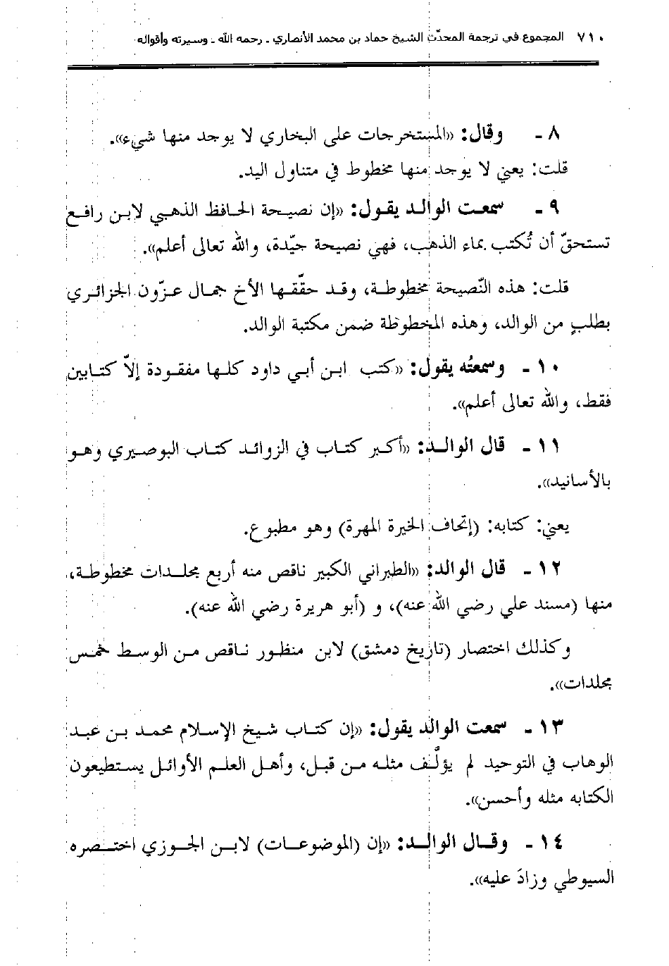 10ـ وسمعتُه يقول: "كتب ابن أبي داود كلها مفقودة إلاّ كتابين فقط، والله تعالى أعلم".