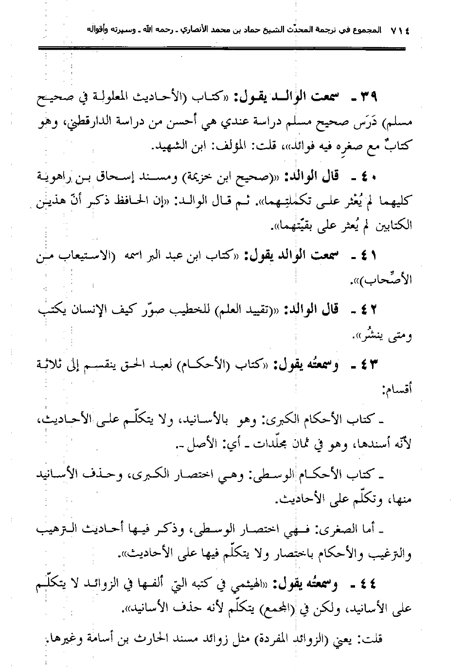39ـ سمعت الوالد يقول: "كتاب (الأحاديث المعلولة في صحيح مسلم) دَرَس صحيح مسلم دراسة عندي هي أحسن من دراسة الدارقطني، وهو كتابٌ مع صغرِه فيه فوائد"، قلت: المؤلف: ابن الشهيد.
