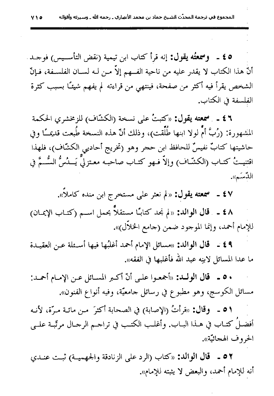 51ـ وقال: "قرأتُ (الإصابة) في الصحابة أكثرَ من مائة مرّة، لأنه أفضلُ كتاب في هذا الباب. وأغلب الكتب في تراجم الرجال مرتّبة على الحروف الهجائيّة".