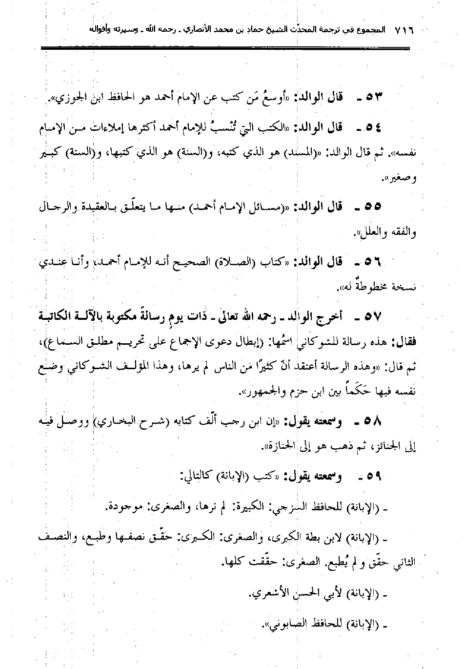 54ـ قال الوالد: "الكتب التي تُنْسبُ للإمام أحمد أكثرها إملاءات من الإمام نفسه". ثم قال الوالد: " (المسند) هو الذي كتبه، و (السنة) هو الذي كتبها، و (السنة) كبير وصغير".