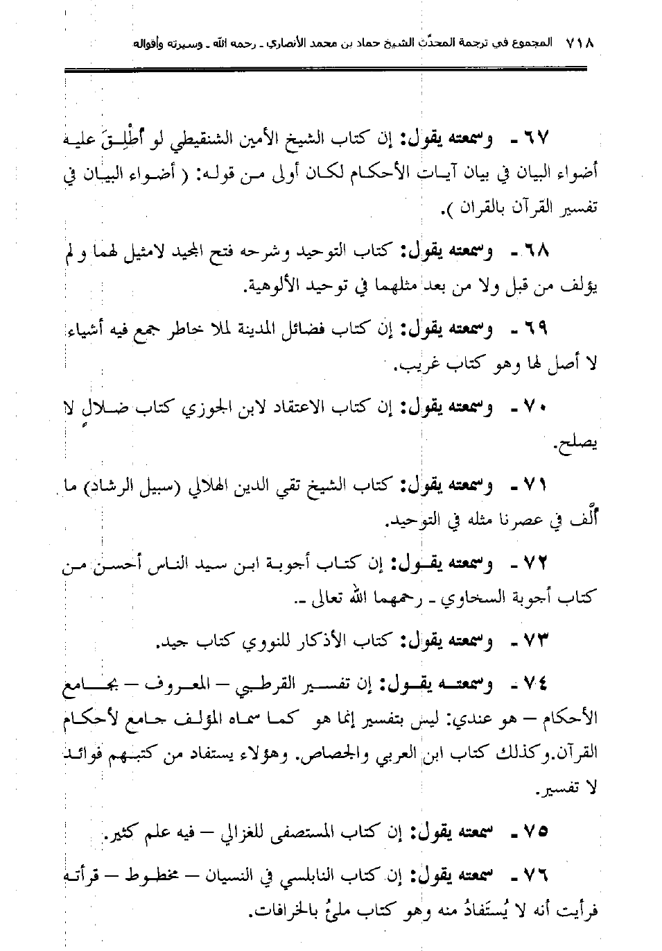 71ـ وسمعته يقول: "كتاب الشيخ تقي الدين الهلالي (سبيل الرشاد) ما أُلَّف في عصرنا مثله في التوحيد".