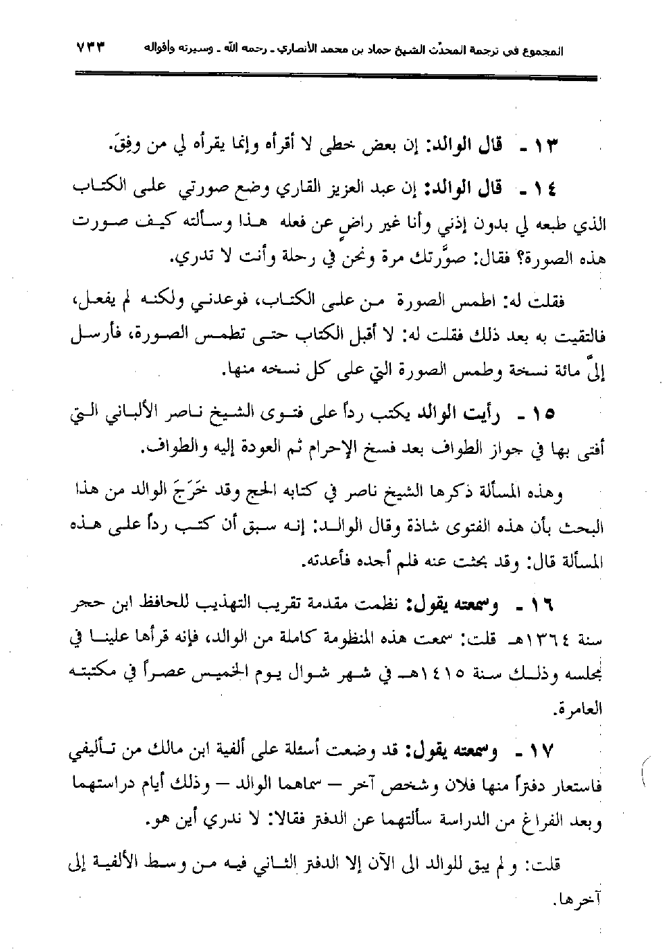 14ـ قال الوالد: "إن عبد العزيز القاري وضع صورتي على الكتاب الذي طبعه لي بدون إذني وأنا غير راضٍ عن فعله هذا وسألته كيف صورت هذه الصورة؟ فقال: صوَّرتك مرة ونحن في رحلة وأنت لا تدري. فقلت له: اطمس الصورة من على الكتاب، فوعدني ولكنه لم يفعل، فالتقيت به بعد ذلك فقلت له: لا أقبل الكتاب حتى تطمس الصورة، فأرسل إلىَّ مائة نسخة وطمس الصورة التي على كل نسخه منها".