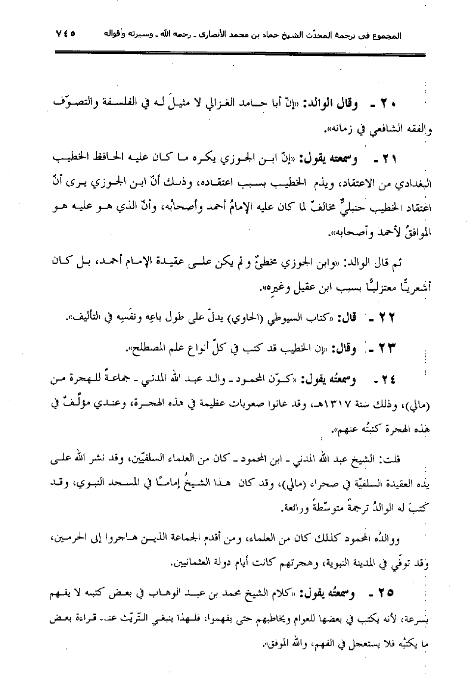 25ـ وسمعتُه يقول: "كلام الشيخ محمد بن عبد الوهاب في بعض كتبه لا يفهم بسرعة، لأنه يكتب في بعضها للعوام ويخاطبهم حتى يفهموا، فلهذا ينبغي التّريّث عند قراءة بعض ما يكتبُه فلا يستعجل في الفهم، والله الموفق".