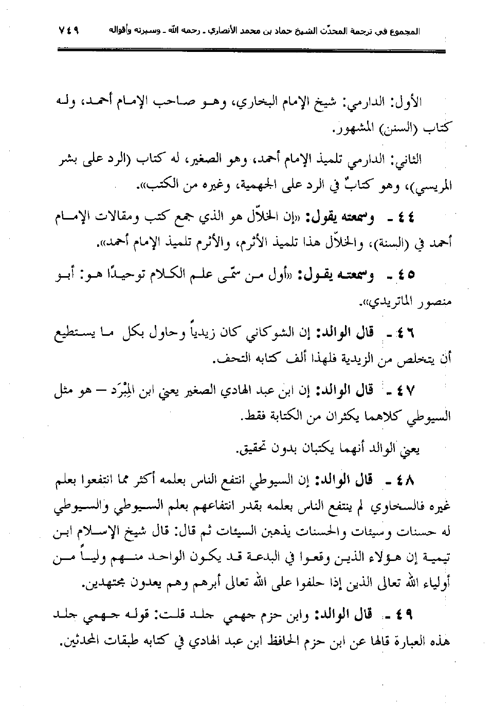 44ـ وسمعته يقول: "إن الخلاّل هو الذي جمع كتب ومقالات الإمام أحمد في (السنة) ، والخلاّل هذا تلميذ الأثرم، والأثرم تلميذ الإمام أحمد".