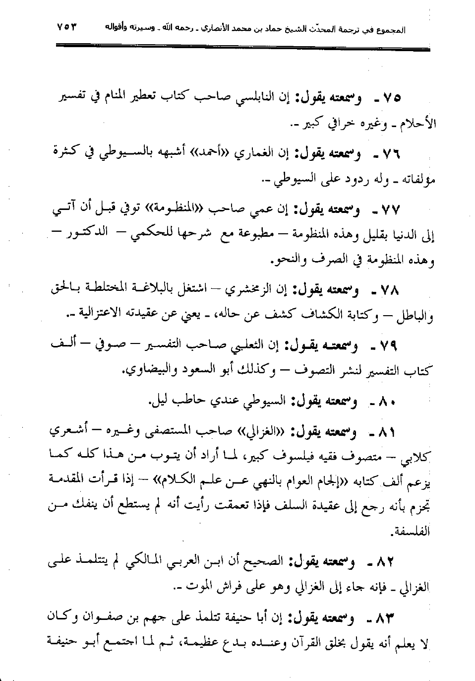 75ـ وسمعته يقول: "إن النابلسي صاحب كتاب تعطير المنام في تفسير الأحلام -وغيره خرافي كبير-".