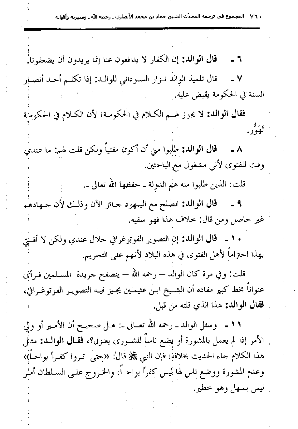10ـ قال الوالد: "إن التصوير الفوتوغرافي حلال عندي ولكن لا أفتي بهذا احتراماً لأهل الفتوى في هذه البلاد لأنهم على التحريم."