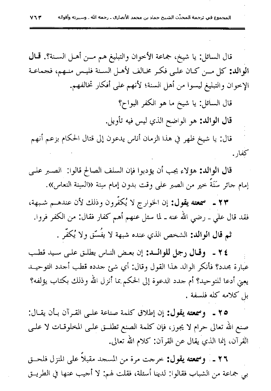 23ـ سمعته يقول: "إن الخوارج لا يُكفّرون وذلك لأن عندهم شبهة، فقد قال علي -رضي الله عنه- لما سئل عنهم أهم كفار فقال: من الكفر فروا.