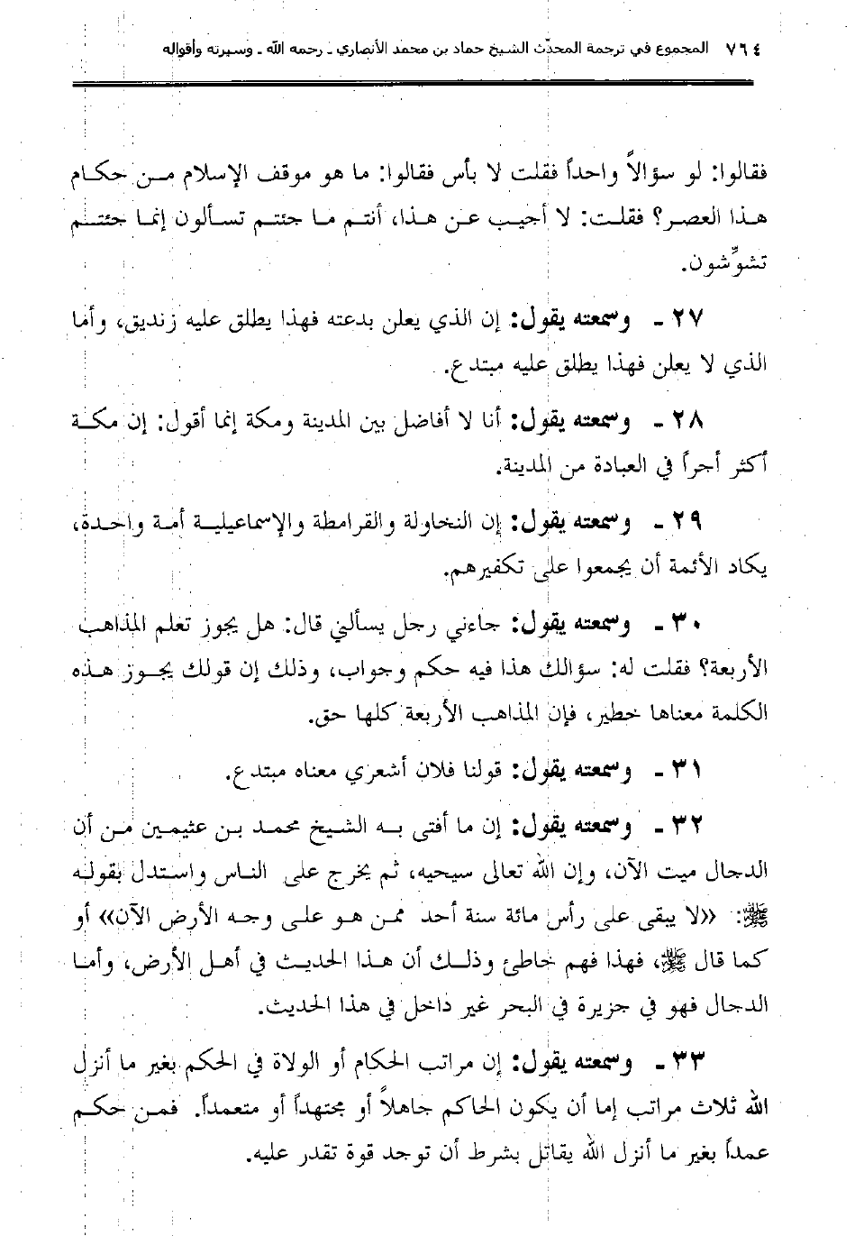 33ـ وسمعته يقول: "إن مراتب الحكام أو الولاة في الحكم بغير ما أنزل الله ثلاث مراتب إما أن يكون الحاكم جاهلاً أو مجتهداً أو متعمداً. فمن حكم عمداً بغير ما أنزل الله يقاتل بشرط أن توجد قوة تقدر عليه".