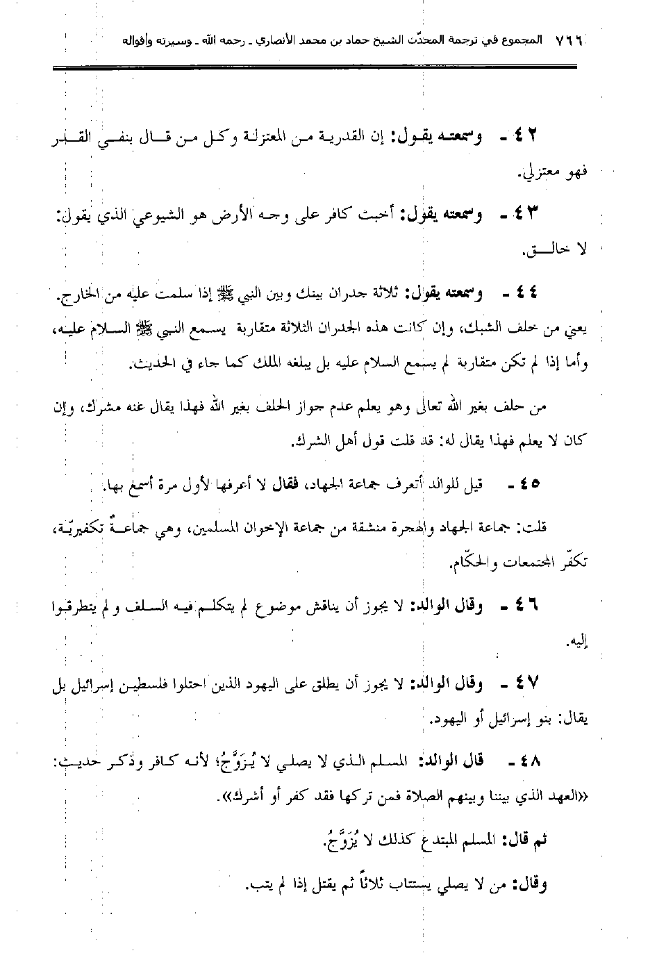 42ـ وسمعته يقول: "إن القدرية من المعتزلة وكل من قال بنفي القدر فهو معتزلي".