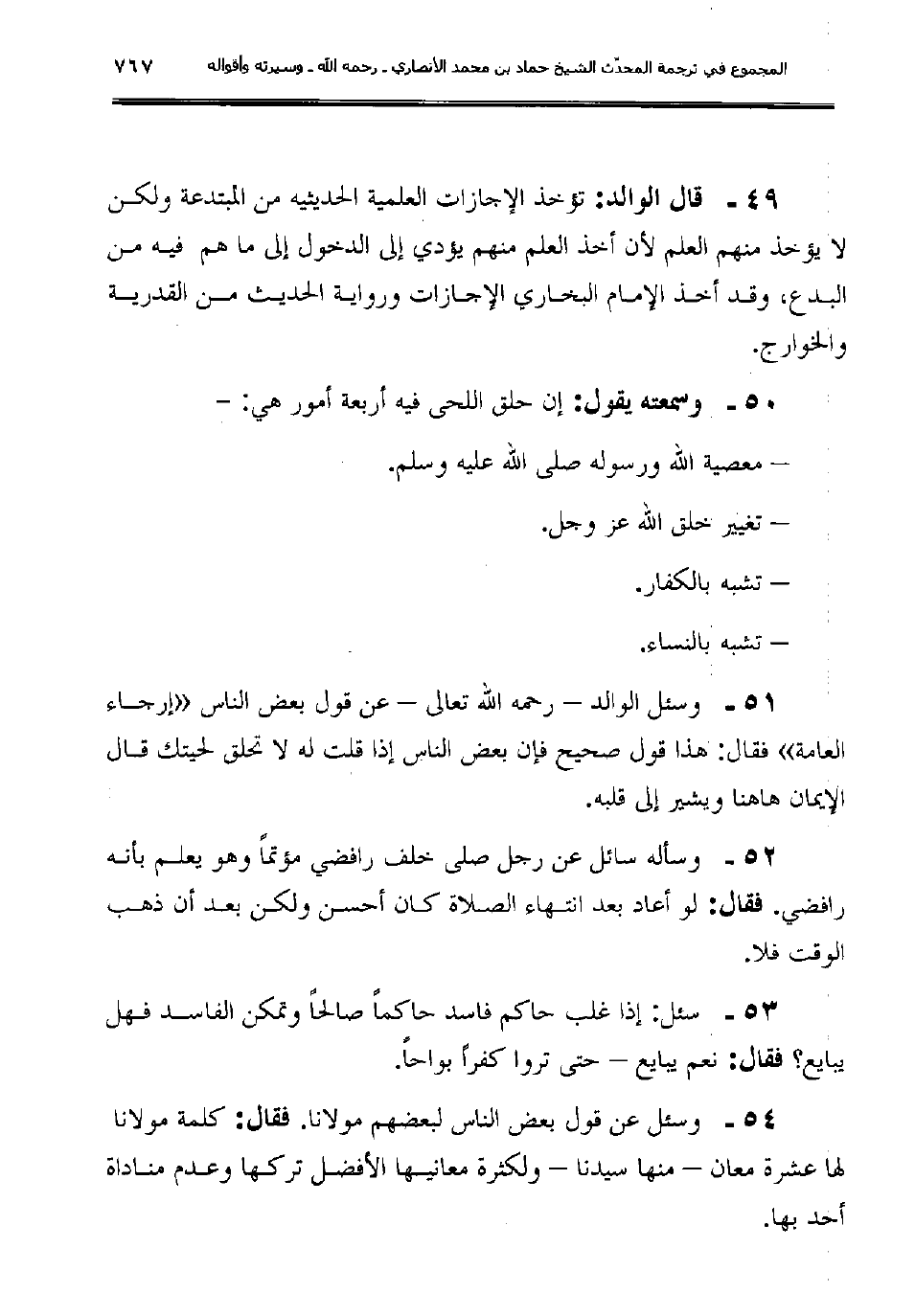 51ـ وسئل الوالد –رحمه الله تعالى– عن قول بعض الناس "إرجاء العامة" فقال: "هذا قول صحيح فإن بعض الناس إذا قلت له لا تحلق لحيتك قال الإيمان هاهنا ويشير إلى قلبه".