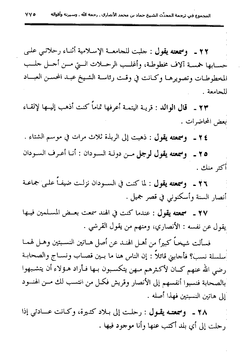 27ـ سمعته يقول: "عندما كنت في الهند سمعت بعض المسلمين فيها يقول عن نفسه: الأنصاري، ومنهم من يقول القرشي".