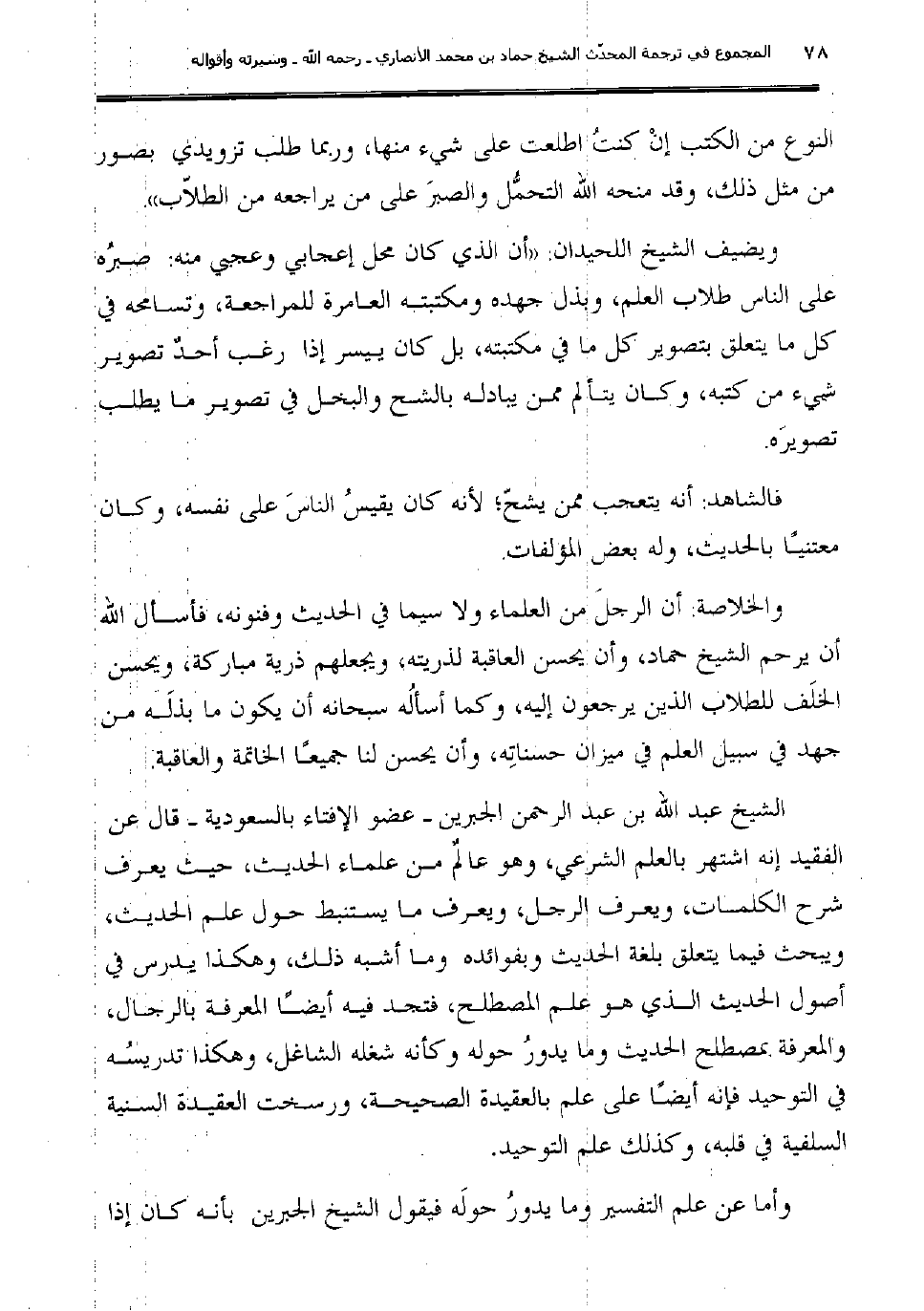 والخلاصة: أن الرجلَ من العلماء ولا سيما في الحديث وفنونه؛ فأسأل الله أن يرحم الشيخ حماد، وأن يحسن العاقبة لذريته، ويجعلهم ذرية مباركة، ويحسن الخلَف للطلاب الذين يرجعون إليه؛ وكما أسألُه سبحانه أن يكون ما بذلَه من جهد في سبيل العلم في ميزان حسناتِه، وأن يحسن لنا جميعًا الخاتمة والعاقبة.
