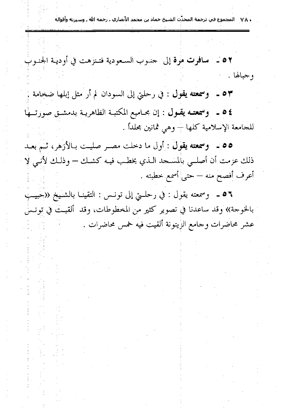 56ـ وسمعته يقول: "في رحلتي إلى تونس: التقينا بالشيخ (حبيب بالخوجة) وقد ساعدنا في تصوير كثير من المخطوطات، وقد ألقيت في تونس عشر محاضرات وجامع الزيتونة ألقيت فيه خمس محاضرات".