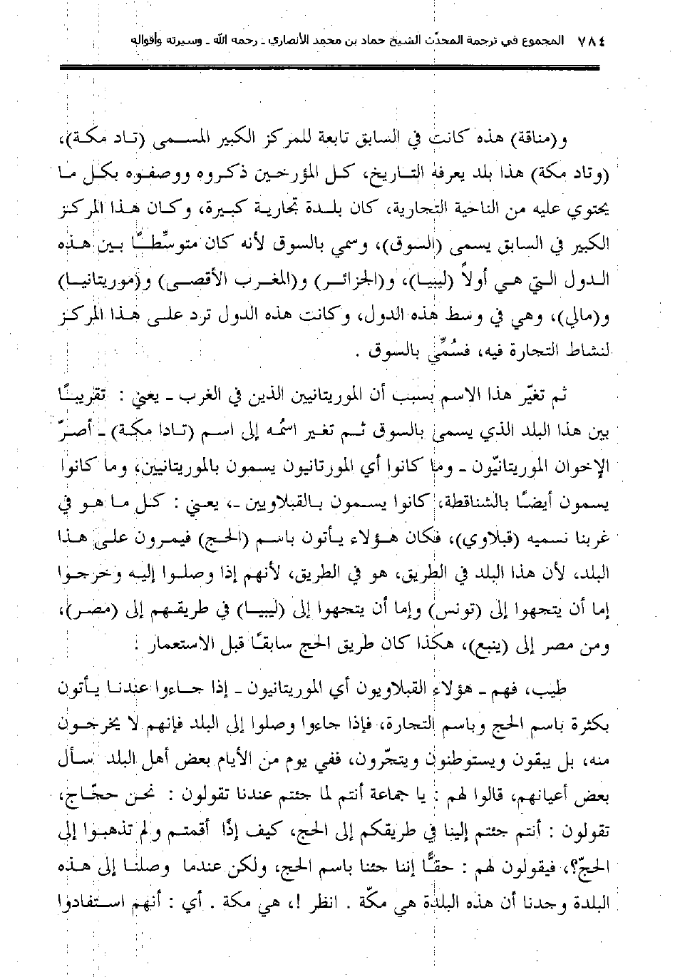 ثم تغيّر هذا الاسم بسبب أن الموريتانيين الذين في الغرب -يعني: تقريبًا بين هذا البلد الذي يسمى بالسوق ثم تغير اسمُه إلى اسم (تادا مكة) -أصرّ الإخوان الموريتانيّون- وما كانوا أي المورتانيون يسمون بالموريتانيين، وما كانوا يسمون أيضًا بالشناقطة، كانوا يسمون بالقبلاويين ـ، يعني: كل ما هو في غربنا نسميه (قبلاوي) ، فكان هؤلاء يأتون باسم (الحج) فيمرون على هذا البلد، لأن هذا البلد في الطريق، هو في الطريق، لأنهم إذا وصلوا إليه وخرجوا إما أن يتجهوا إلى (تونس) وإما أن يتجهوا إلى (ليبيا) في طريقهم إلى (مصر) ، ومن مصر إلى (ينبع) ، هكذا كان طريق الحج سابقًا قبل الاستعمار.