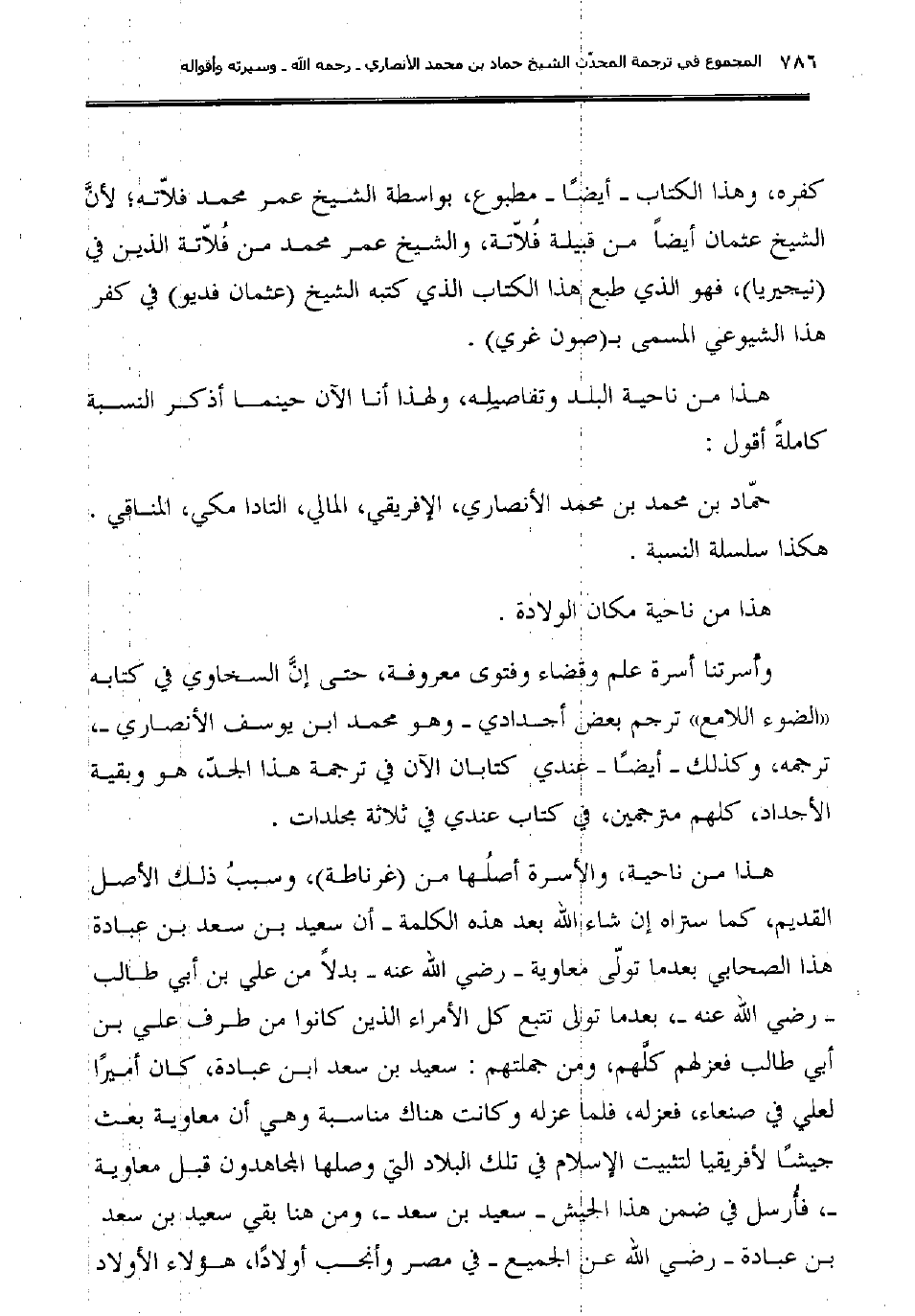 حمّاد بن محمد بن محمد الأنصاري، الإفريقي، المالي، التادا مكي، المناقي. هكذا سلسلة النسبة.