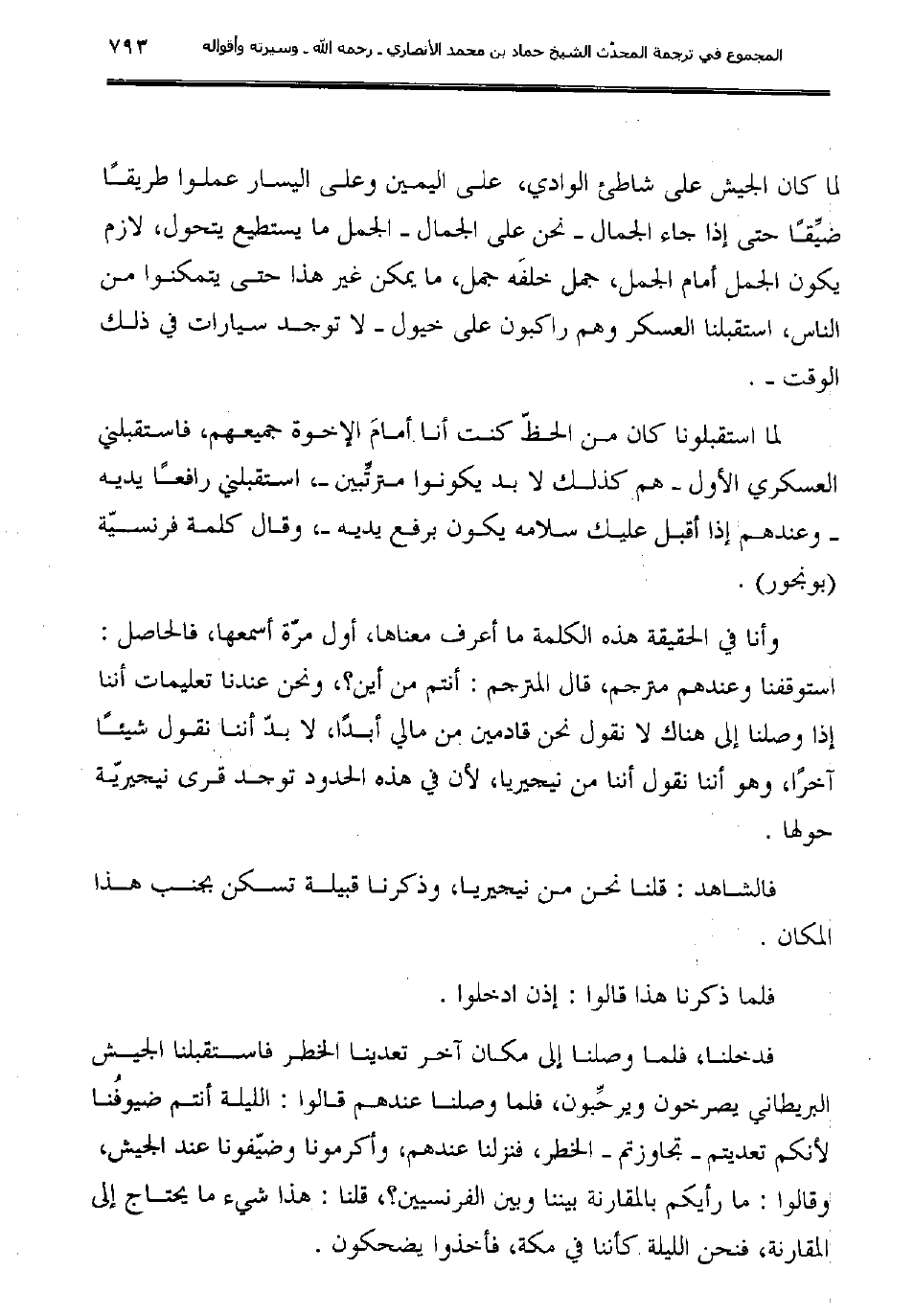 وأنا في الحقيقة هذه الكلمة ما أعرف معناها، أول مرّة أسمعها، فالحاصل: استوقفنا وعندهم مترجم، قال المترجم: أنتم من أين؟، ونحن عندنا تعليمات أننا إذا وصلنا إلى هناك لا نقول نحن قادمين من مالي أبدًا، لا بدّ أننا نقول شيئًا آخرًا، وهو أننا نقول أننا من نيجيريا، لأن في هذه الحدود توجد قرى نيجيريّة حولها.