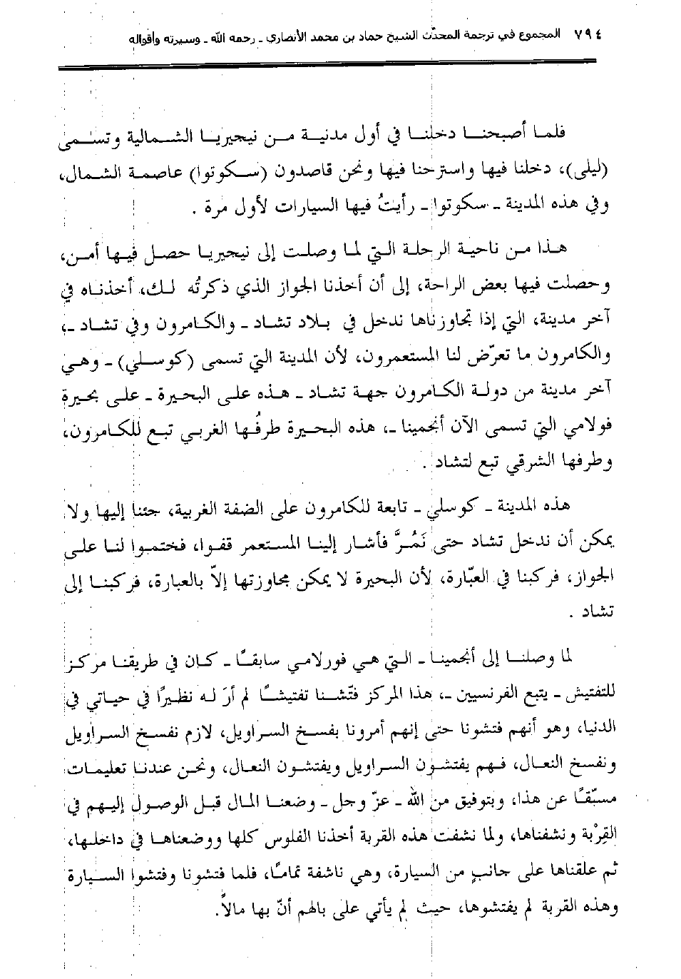 هذا من ناحية الرحلة التي لما وصلت إلى نيجيريا حصل فيها أمن، وحصلت فيها بعض الراحة، إلى أن أخذنا الجواز الذي ذكرتُه لك، أخذناه في آخر مدينة، التي إذا تجاوزناها ندخل في بلاد تشاد -والكامرون وفي تشاد ـ، والكامرون ما تعرّض لنا المستعمرون، لأن المدينة التي تسمى (كوسلي) -وهي آخر مدينة من دولة الكامرون جهة تشاد -هذه على البحيرة- على بحيرة فولامي التي تسمى الآن أنجميناـ، هذه البحيرة طرفُها الغربي تبع للكامرون، وطرفها الشرقي تبع لتشاد.