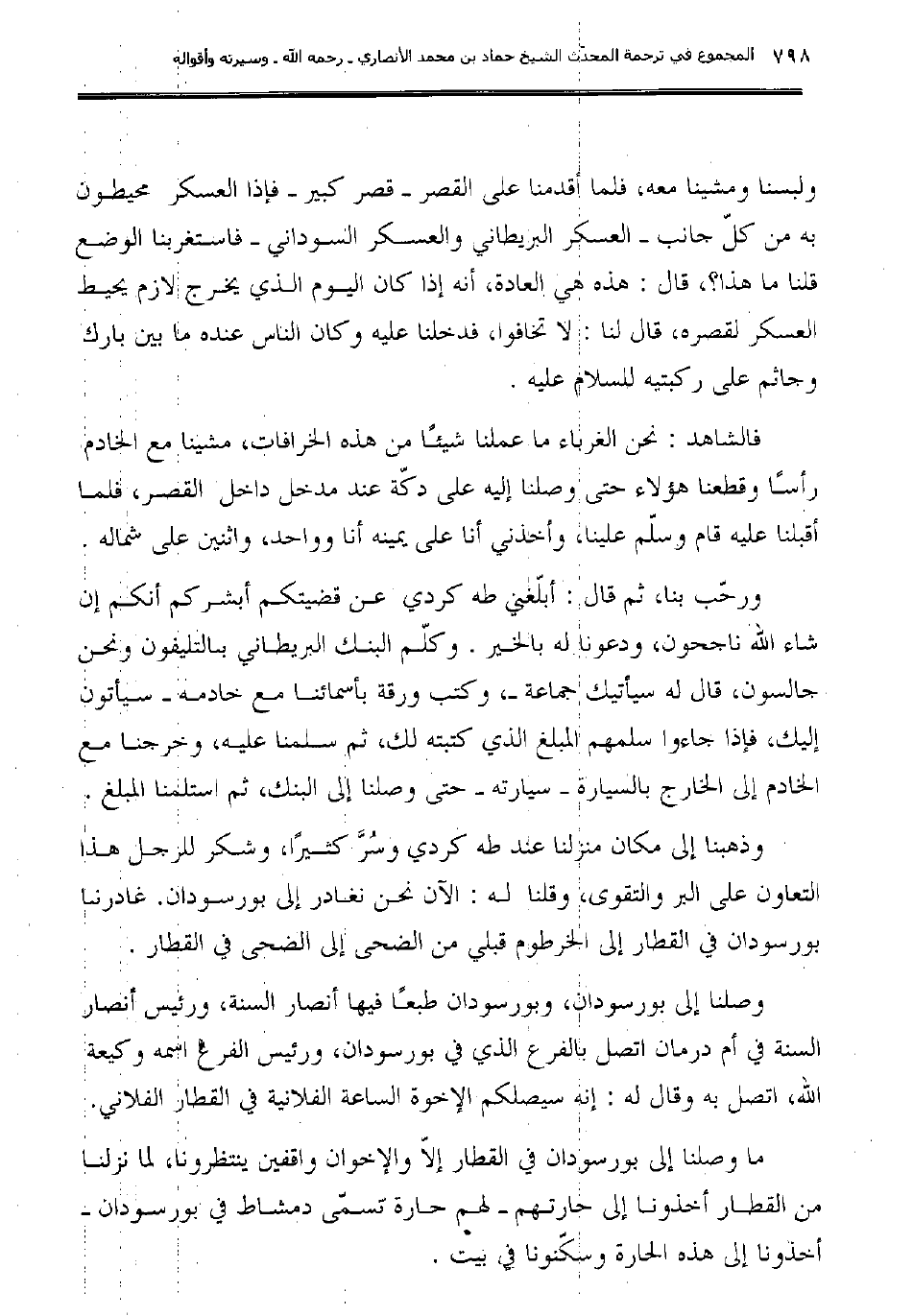 ولبسنا ومشينا معه، فلما أقدمنا على القصر -قصر كبير- فإذا العسكر محيطون به من كلّ جانب -العسكر البريطاني والعسكر السوداني- فاستغربنا الوضع قلنا ما هذا؟، قال: هذه هي العادة، أنه إذا كان اليوم الذي يخرج لازم يحيط العسكر لقصره، قال لنا: لا تخافوا، فدخلنا عليه وكان الناس عنده ما بين بارك وجاثم على ركبتيه للسلام عليه.