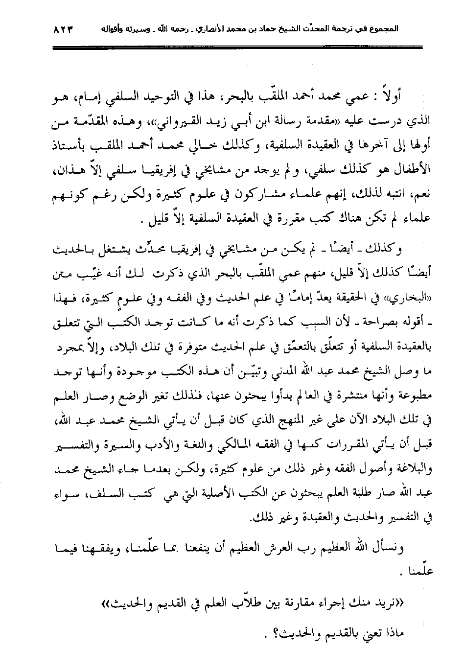 وكذلك -أيضًا- لم يكن من مشايخي في إفريقيا محدِّث يشتغل بالحديث أيضًا كذلك إلاّ قليل، منهم عمي الملقّب بالبحر الذي ذكرت لك أنه غيّب متن "البخاري" في الحقيقة يعدّ إمامًا في علم الحديث وفي الفقه وفي علومٍ كثيرة، فهذا-أقوله بصراحة -لأن السبب كما ذكرت أنه ما كانت توجد الكتب التي تتعلق بالعقيدة السلفية أو تتعلّق بالتعمّق في علم الحديث متوفرة في تلك البلاد، وإلاّ بمجرد ما وصل الشيخ محمد عبد الله المدني وتبيّن أن هذه الكتب موجودة وأنها توجد مطبوعة وأنها منتشرة في العالم بدأوا يبحثون عنها، فلذلك تغير الوضع وصار العلم في تلك البلاد الآن على غير المنهج الذي كان قبل أن يأتي الشيخ محمد عبد الله،