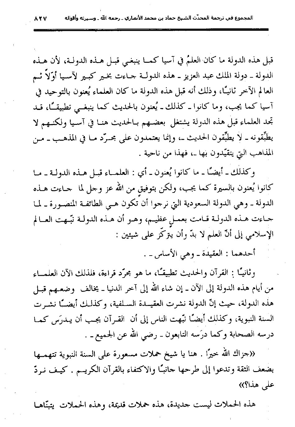 وثانيًا: القرآن والحديث تطبيقًا، ما هو مجرّد قراءة، فلذلك الآن العلماء من أيام هذه الدولة إلى الآن -إن شاء الله إلى آخر الدنيا -يخالف وضعهم قبل هذه الدولة، حيث إنّ الدولة نشرت العقيدة السلفية، وكذلك أيضًا نشرت السنة النبوية، وكذلك أيضًا نبّهت الناس إلى أن القرآن يجب أن يدرَس كما درسه الصحابة وكما درَسه التابعون -رضي الله عن الجميع-".