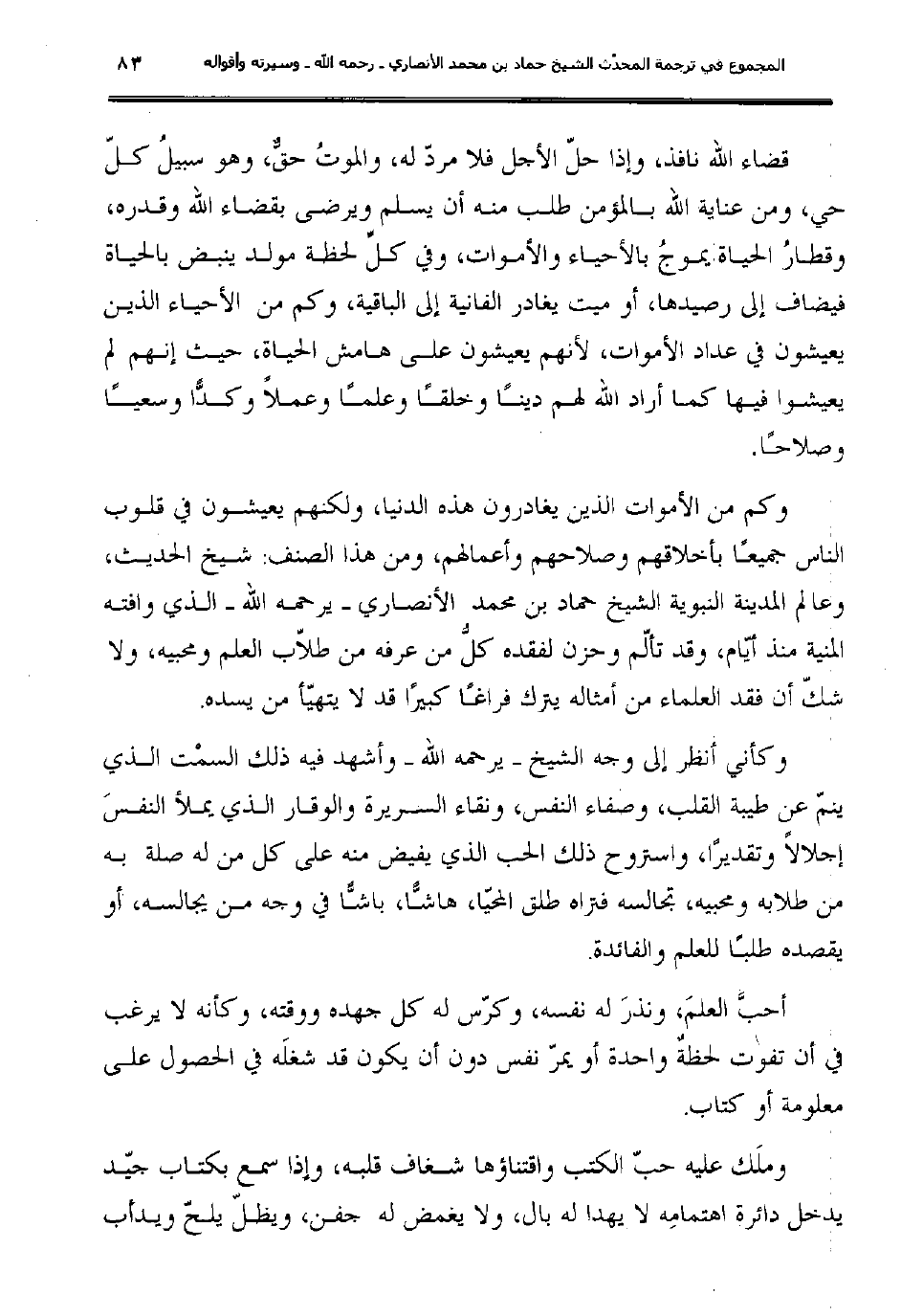 وكم من الأموات الذين يغادرون هذه الدنيا، ولكنهم يعيشون في قلوب الناس جميعًا بأخلاقهم وصلاحهم وأعمالهم؛ ومن هذا الصنف: شيخ الحديث، وعالم المدينة النبوية الشيخ حماد بن محمد الأنصاري "يرحمه الله" الذي وافته المنية منذ أيّام؛ وقد تألّم وحزن لفقده كلُّ من عرفه من طلاّب العلم ومحبيه، ولا شكّ أن فقد العلماء من أمثاله يترك فراغًا كبيرًا قد لا يتهيّأ من يسده.