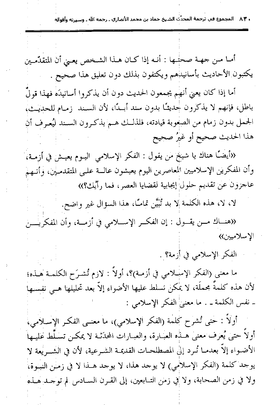 أولاً: حتى تُشرح كلمة (الفكر الإسلامي) ، ما معنى الفكر الإسلامي، أولاً حتى يُعرف معنى هذه العبارة، والعبارات المحدَثة لا يمكن تسلَّط عليها الأضواء إلاّ بعدما تُرد إلى المصطلحات القديمة الشرعية، لأن في الشريعة لا يوجد كلمة (الفكر الإسلامي) لا يوجد هذا، لا يوجد هذا لا في زمن النبوة، ولا في زمن الصحابة، ولا في زمن التابعين، إلى القرن السادس لم توجد هذه