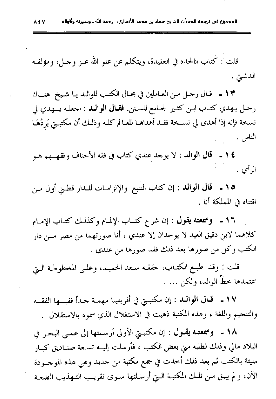 17ـ قال الوالد: "إن مكتبتي في أفريقيا مهمة جداً ففيها الفقه والتنجيم واللغة, وهذه المكتبة ذهبت في الاستغلال الذي سموه بالاستقلال".