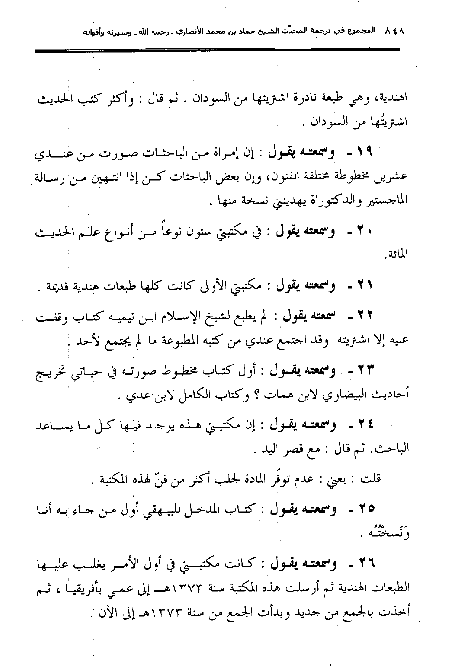 26ـ وسمعته يقول: "كانت مكتبتي في أول الأمر يغلب عليها الطبعات الهندية ثم أرسلت هذه المكتبة سنة 1373هـ إلى عمي بأفريقيا, ثم أخذت بالجمع من جديد وبدأت الجمع من سنة 1373هـ إلى الآن".