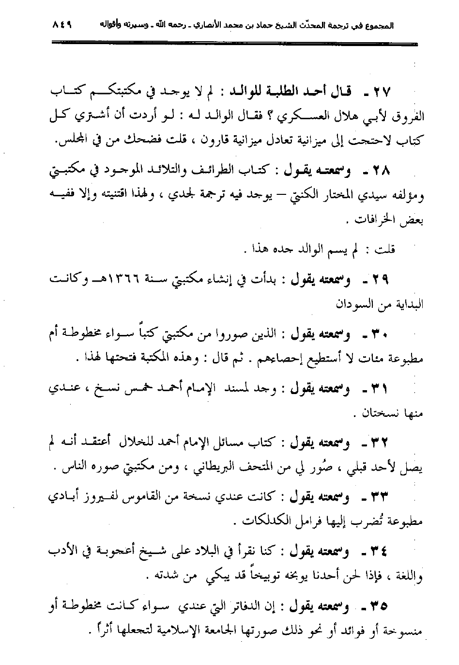 30ـ وسمعته يقول: "الذين صوروا من مكتبتي كتباً سواء مخطوطة أم مطبوعة مئات لا أستطيع إحصاءهم. ثم قال: وهذه المكتبة فتحتها لهذا".
