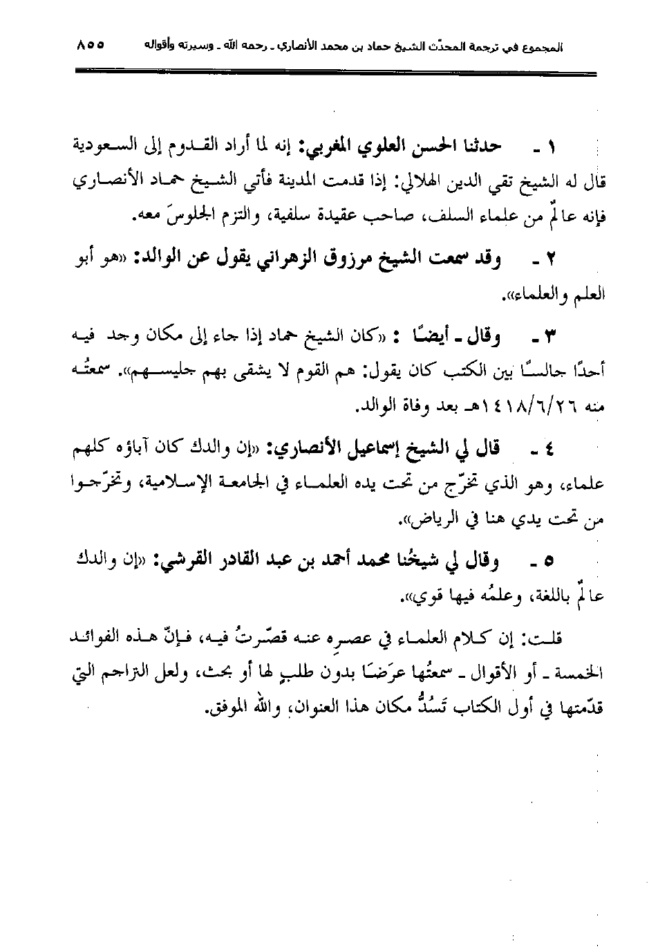 3ـ وقال -أيضًا-: "كان الشيخ حماد إذا جاء إلى مكان وجد فيه أحدًا جالسًا بين الكتب كان يقول: هم القوم لا يشقى بهم جليسهم". سمعتُه منه 26/6/1418هـ بعد وفاة الوالد.
