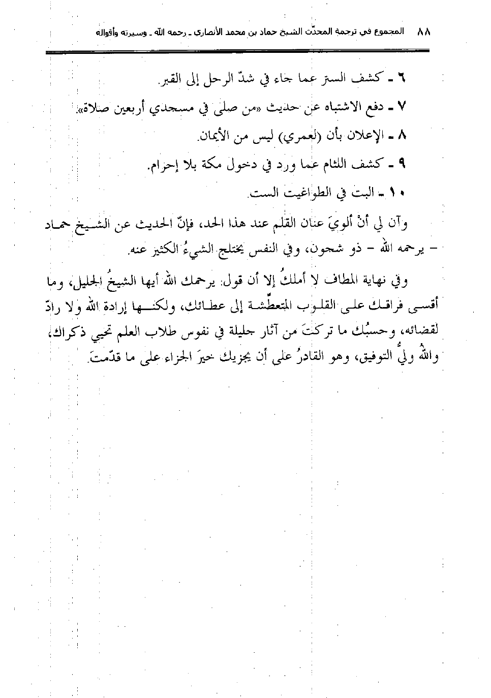 وآن لي أنْ ألويَ عنان القلم عند هذا الحد؛ فإنّ الحديث عن الشيخ حماد "يرحمه الله" ذو شجون، وفي النفس يختلج الشيءُ الكثير عنه.