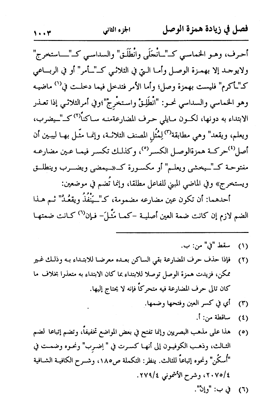 أحرف، وهو الخماسي كـ"انجلى وانطلق" والسداسي كـ"استخرج" ولا يوجد إلا بهمزة الوصل وأما التي في الثلاثي كـ"أمر" أو في الرباعي كـ"أكرم" فليست بهمزة وصل؛ وأما الأمر فتدخل فيما دخلت في ماضيه وهو الخماسي والسداسي نحو: "انطلق واستخرج"؛ وفي أمر الثلاثي إذا تعذر الابتداء به دونها، لكون ما يلي حرف المضارعة منه ساكناً كـ"يضرب، ويعلم، ويعقد" وهي مطابقة لمثل المصنف الثلاثلة، وإنما مثل بها ليبين أن أصل حركة همزة الوصل الكسر، وكذلك تكسر فيما عين مضارعه مفتوحة كـ"يخشى ويعلم" أو مكسورة كـ"يمضي ويضرب وينطلق ويستخرج" وفي الماضي المبني للفاعل مطلقاً، وإنما تضم في موضعين: