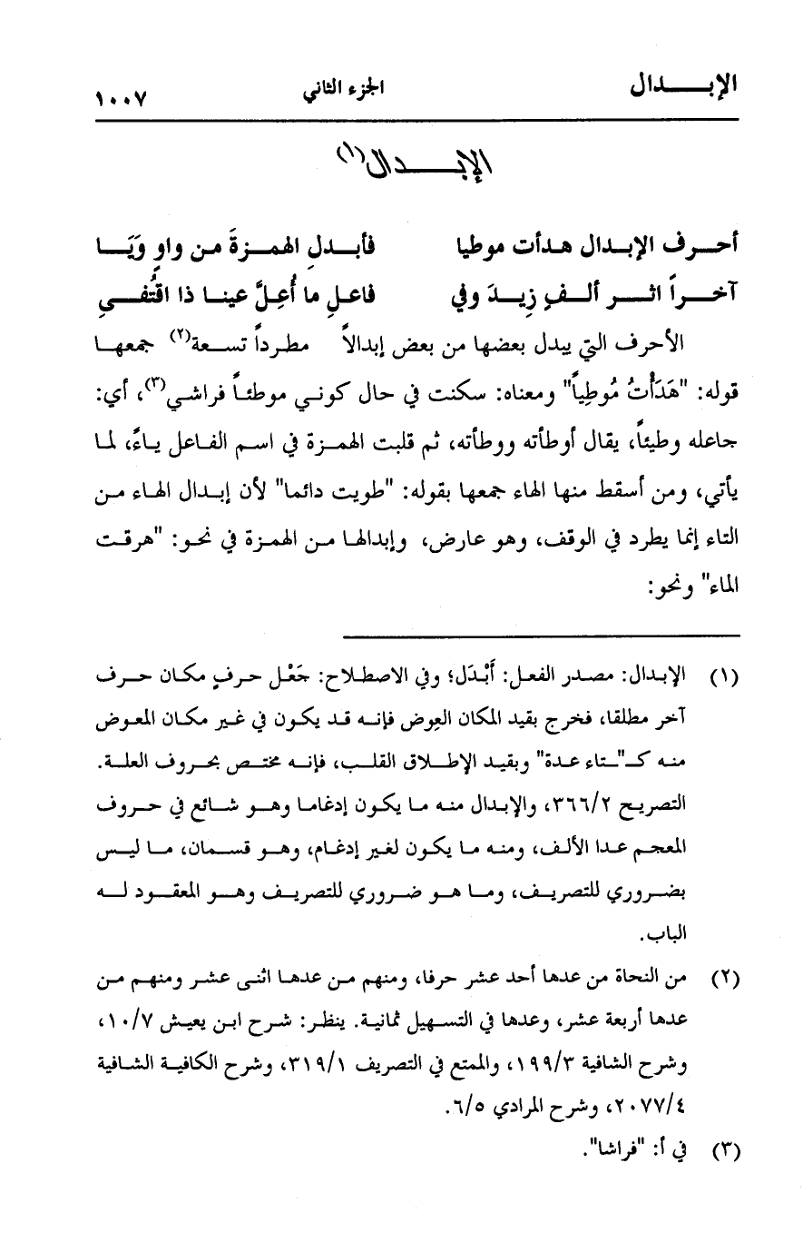 الأحرف التي يبدل بعضها من بعض إبدالاً مطرداً تسعة جمعها قوله: "هدأت موطيا" ومعناه: سكنت في حال كوني موطياً فراشي، أي: جاعله واطيئاً، يقال أوطأته ووطأته، ثم قلبت الهمزة في اسم الفاعل ياءً، لما يأتي، ومن أسقط منها الهاء جمعها بقوله: "طويت دائماً" لأن إبدال الهاء من التاء إنما يطرد في الوقف، وهو عارض، وإبدالها من الهمزة في نحو: "هرقت الماء" ونحو: