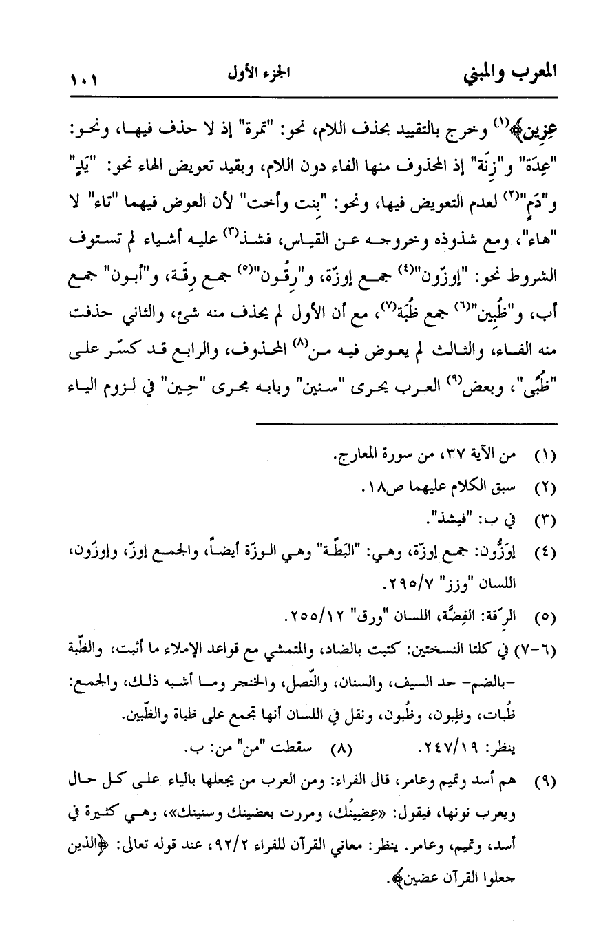 عِزِين}] المعارج: 37 [وخرج بالتقييد بحذف اللام، نحو: "تمرة" إذ لا حذف فيها، ونحو: "عدة" و "زنة" إذ المحذوف منها الفاء دون اللام، وبقيد تعويض الهاء نحو: " يد " و "دم " لعدم التعويض فيها, ونحو: " بنت وأخت " لأن العوض فيهما " تاء " لا " هاء " ومع شذوذه وخروجه عن القياس, فشذ عليه أشياء لم تستوف الشروط نحو: " إوزون " جمع إوزة, و"رقُون " جمع رقة, و "أبون " جمع أب, و"ظُبَة، مع أن الأول لم يحذف منه شيء, والثاني حذفت منه الفاء, والثالث لم يعوض فيه من المحذوف، والرابع قد كسر على "ظُبي "،وبعض العرب يحرى " سنين " وبابه مجرى " حين " في لزوم الياء