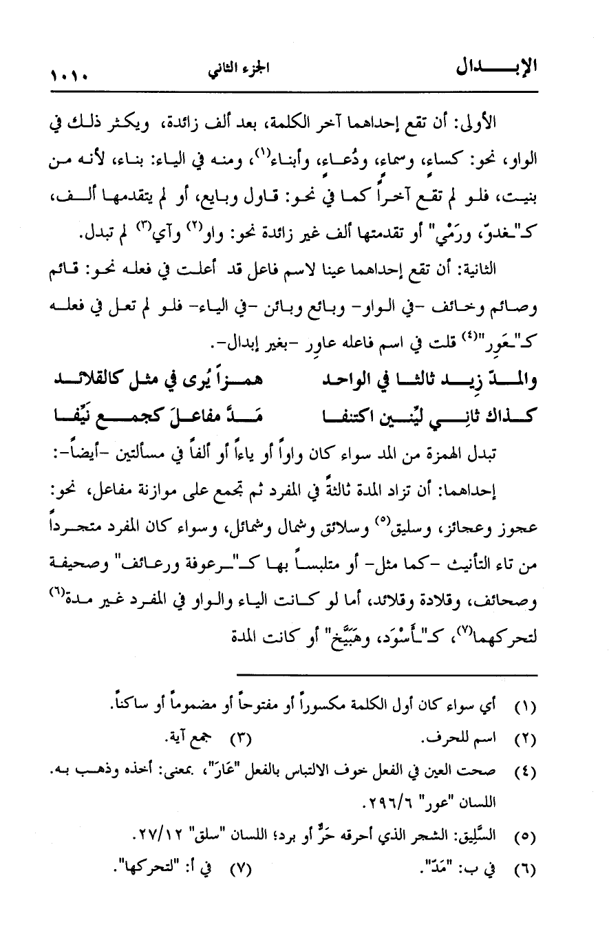 الأولى: أن تقع إحداهما آخر الكلمة، بعد ألف زائدة، ويكثر ذلك في الواو، نحو: كساءٍ، وسماءٍ، ودعاءٍ، وأبناء، ومنه في الياء: بناء، لأنه من بنيت، فلو لم تقع آخراً كما في نحو: قاول وبايع، أو لم يتقدمها ألف، كـ"غدو، ورمي" أو تقدمتها ألف غير زائدة نحو: واو وآي لم تبدل.